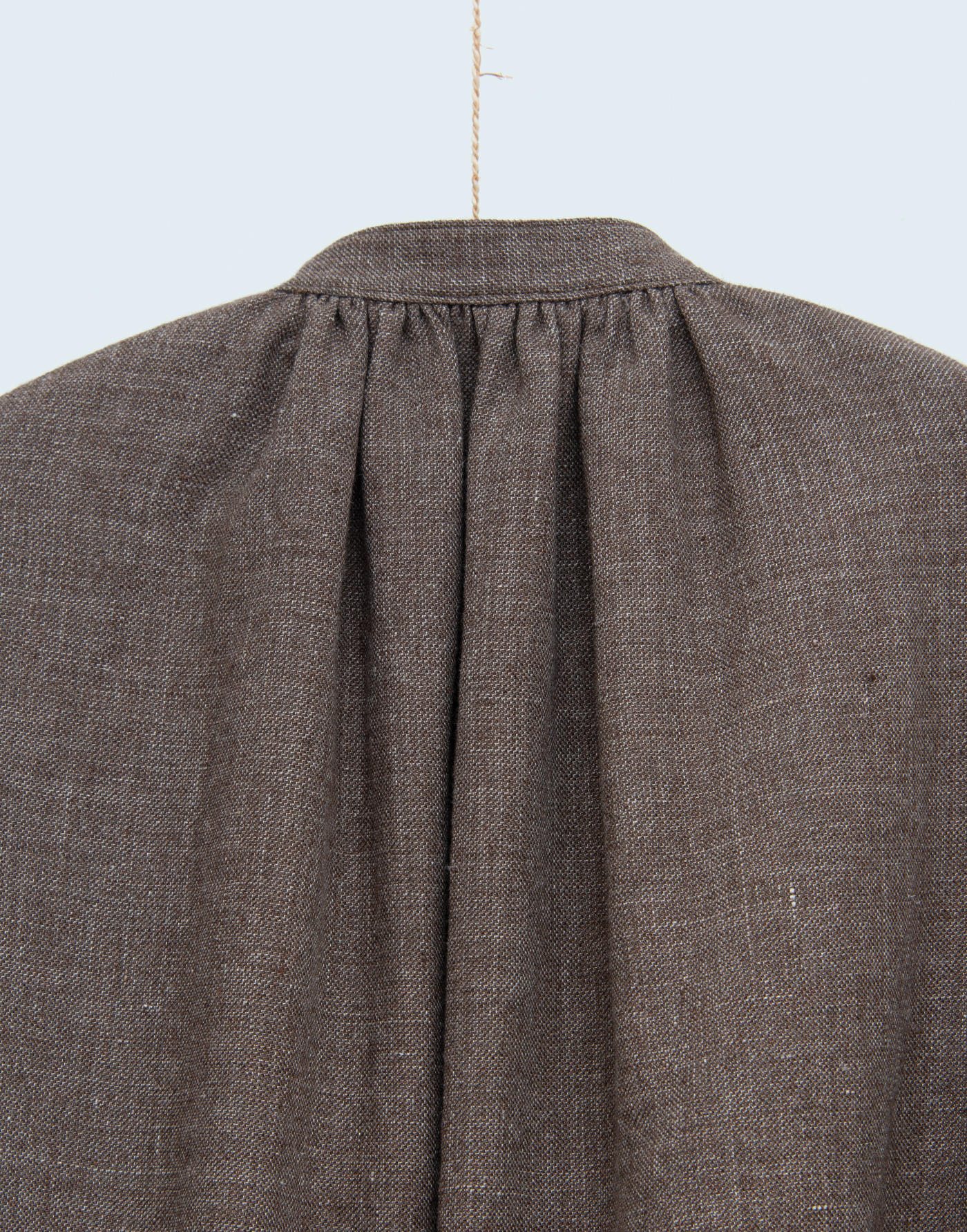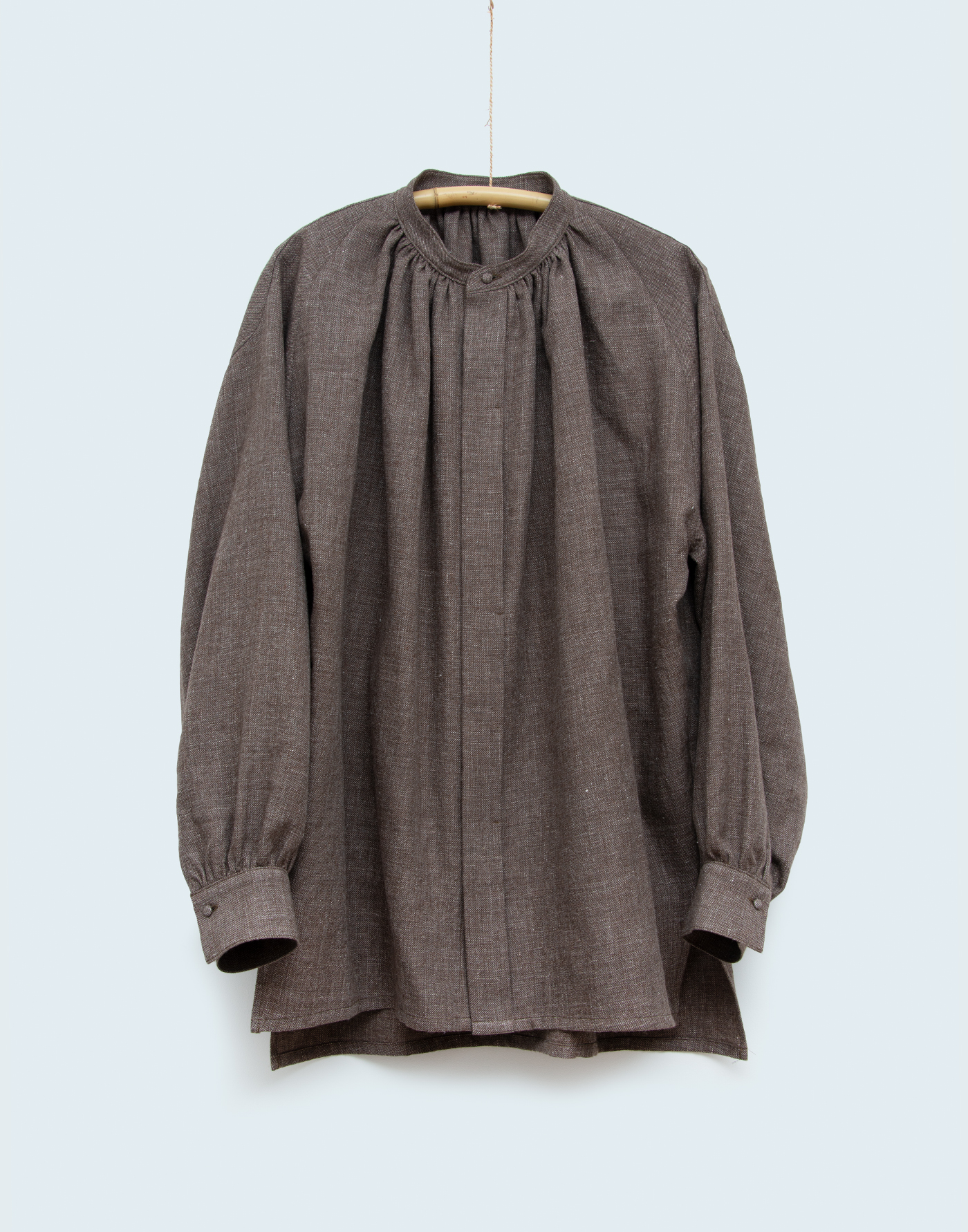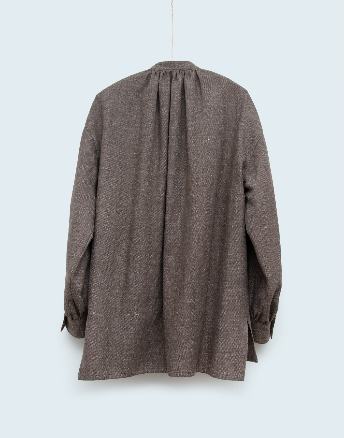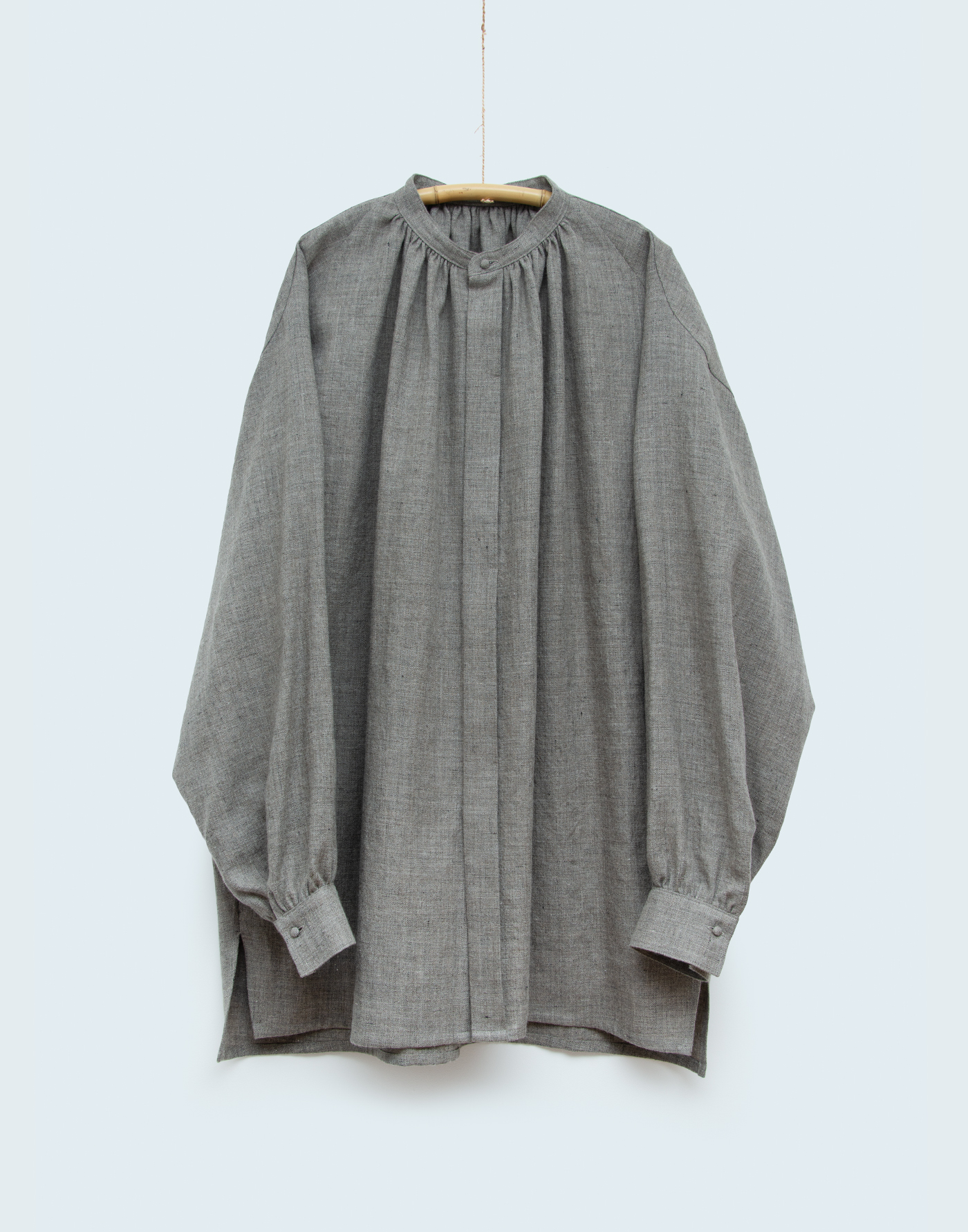 Linen wool sharkskin with a beautiful vintage look and feel. Classic shirts with gathers at the back of the neck. Wool 52%, Linen 48% Size: 0 Length 71 / Width 54 / Cuff from front neck point(through Shoulder point) 74 Size: 3 Length 82.5 / Width 59 / Cuff from front neck point(through Shoulder point) 85 Size: 4 Length 84 / Width 60 / Cuff from front neck point(through Shoulder point) 86 *cm |