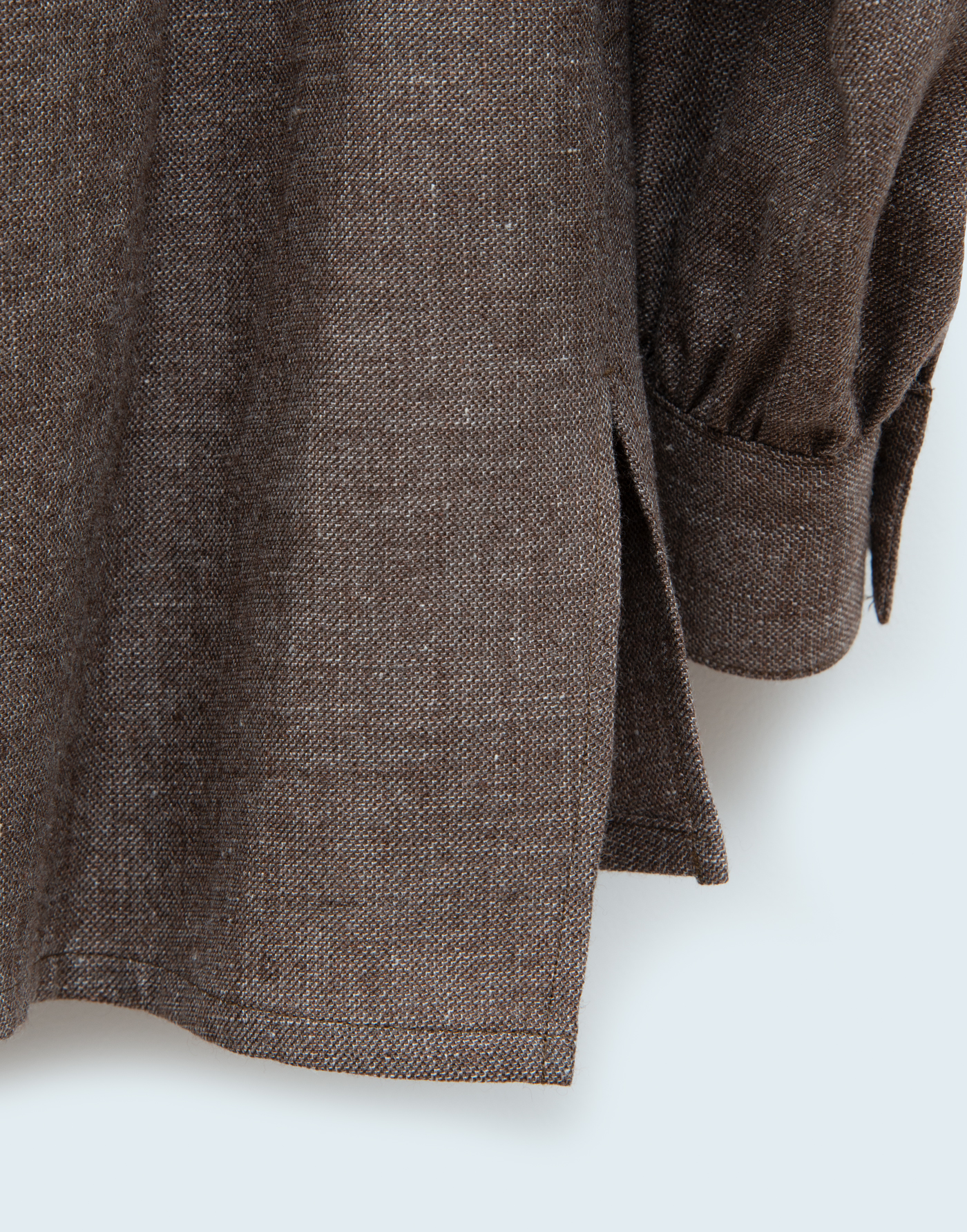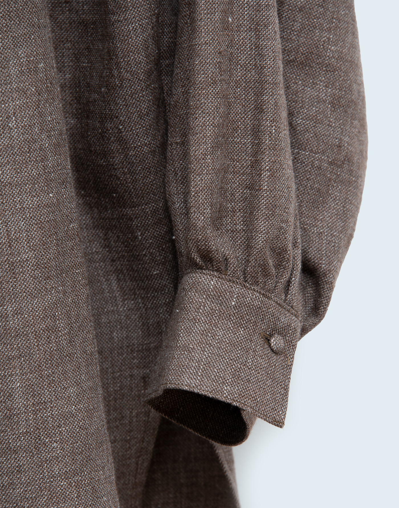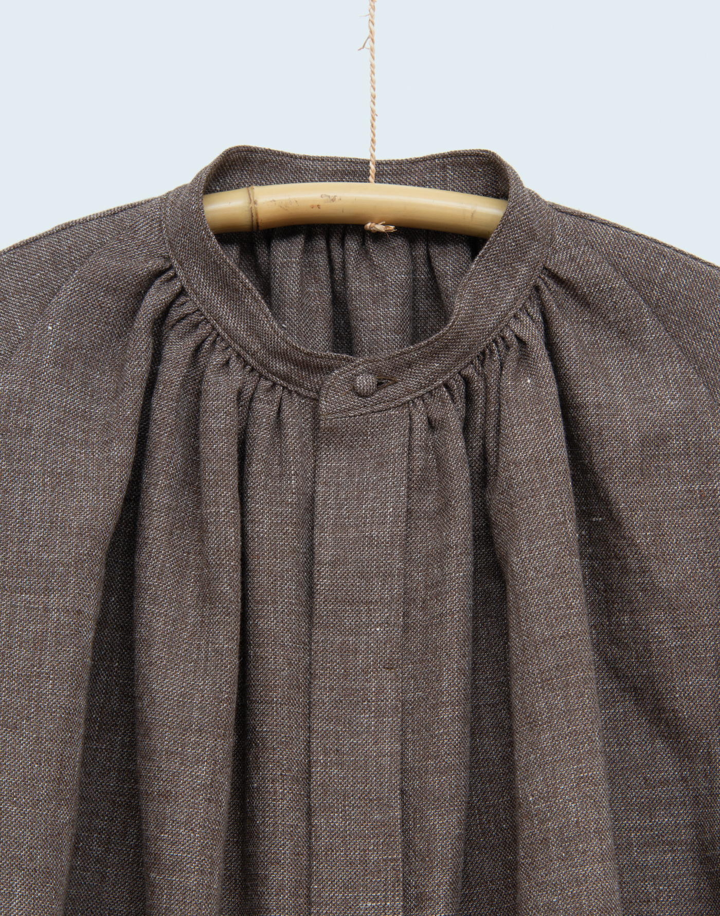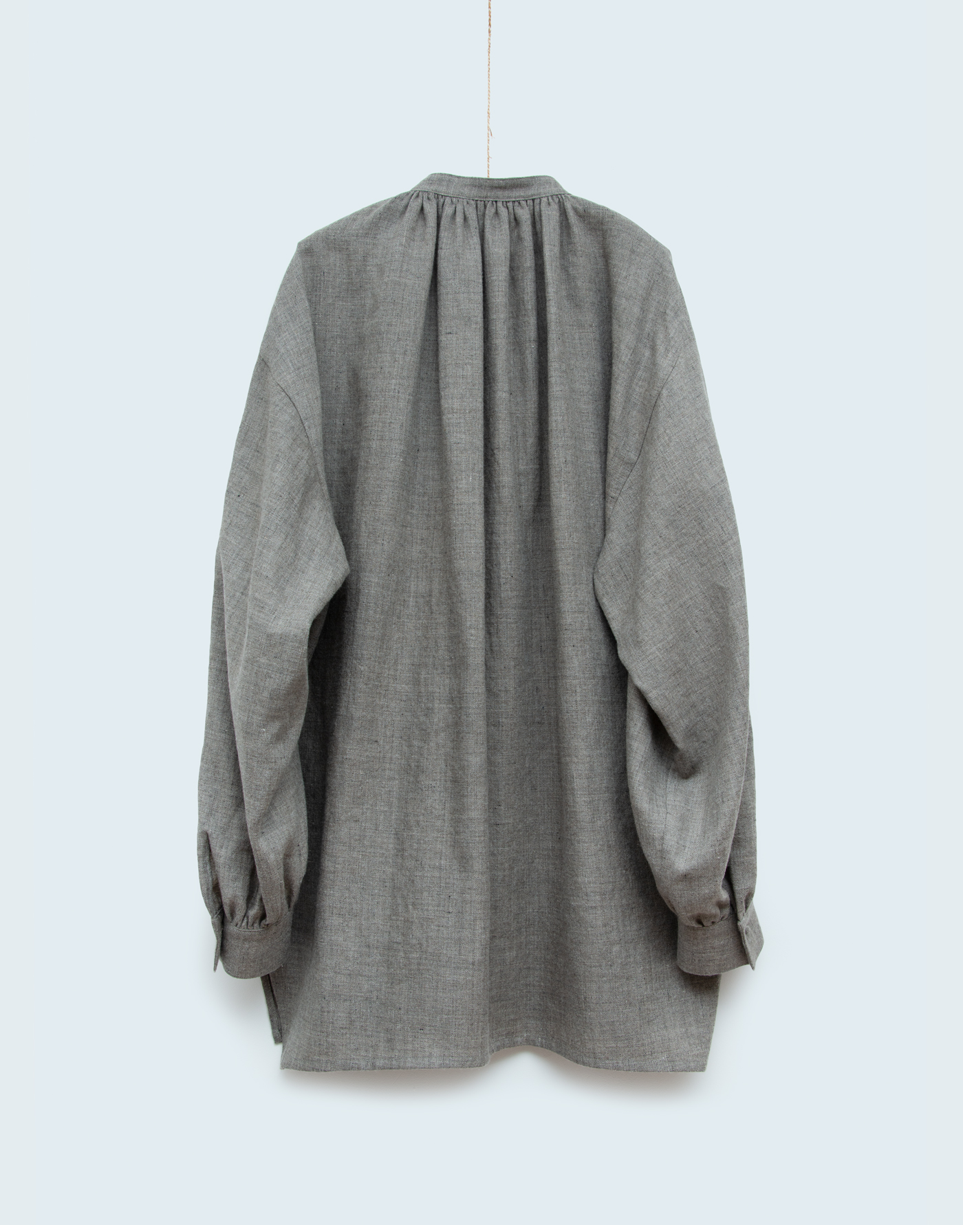 Linen wool sharkskin with a beautiful vintage look and feel. Classic shirts with gathers at the back of the neck. Wool 52%, Linen 48% Size: 0 Length 71 / Width 54 / Cuff from front neck point(through Shoulder point) 74 Size: 3 Length 82.5 / Width 59 / Cuff from front neck point(through Shoulder point) 85 Size: 4 Length 84 / Width 60 / Cuff from front neck point(through Shoulder point) 86 *cm |