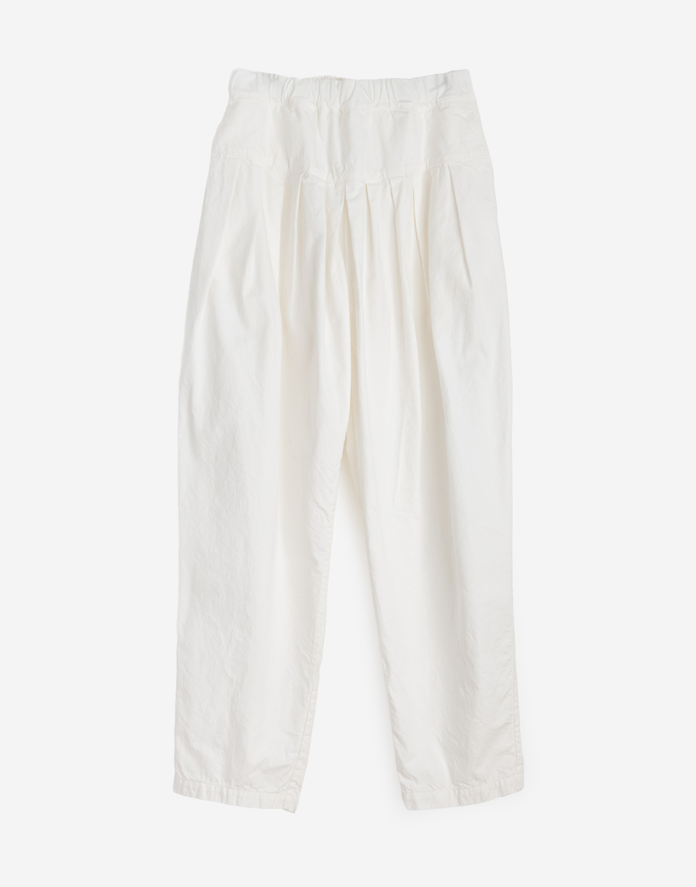 | Folk pants shaped like Indian underwear with tuck pleats. Cotton canvas with a nep texture that gives the impression of old cloth. The piece-dyeing process produces subtle variations of color. Color is White. Cotton 100% Size: 3 Waist 71 / Outseam 100 / Inseam 66.5 / Lap circumference 38 Size: 4 Waist 73 / Outseam 99 / Inseam 65.5 / Lap circumference 38 *cm Model height 184cm, wearing Size 4 Click here for inquiries regarding size. |