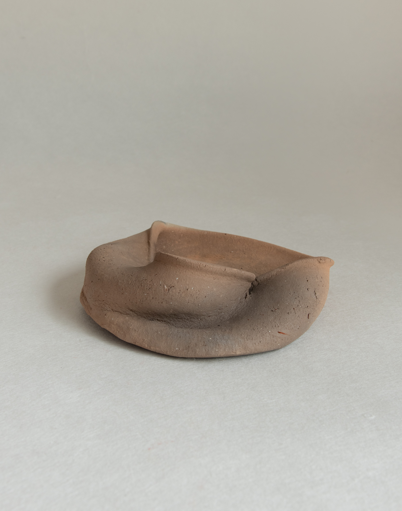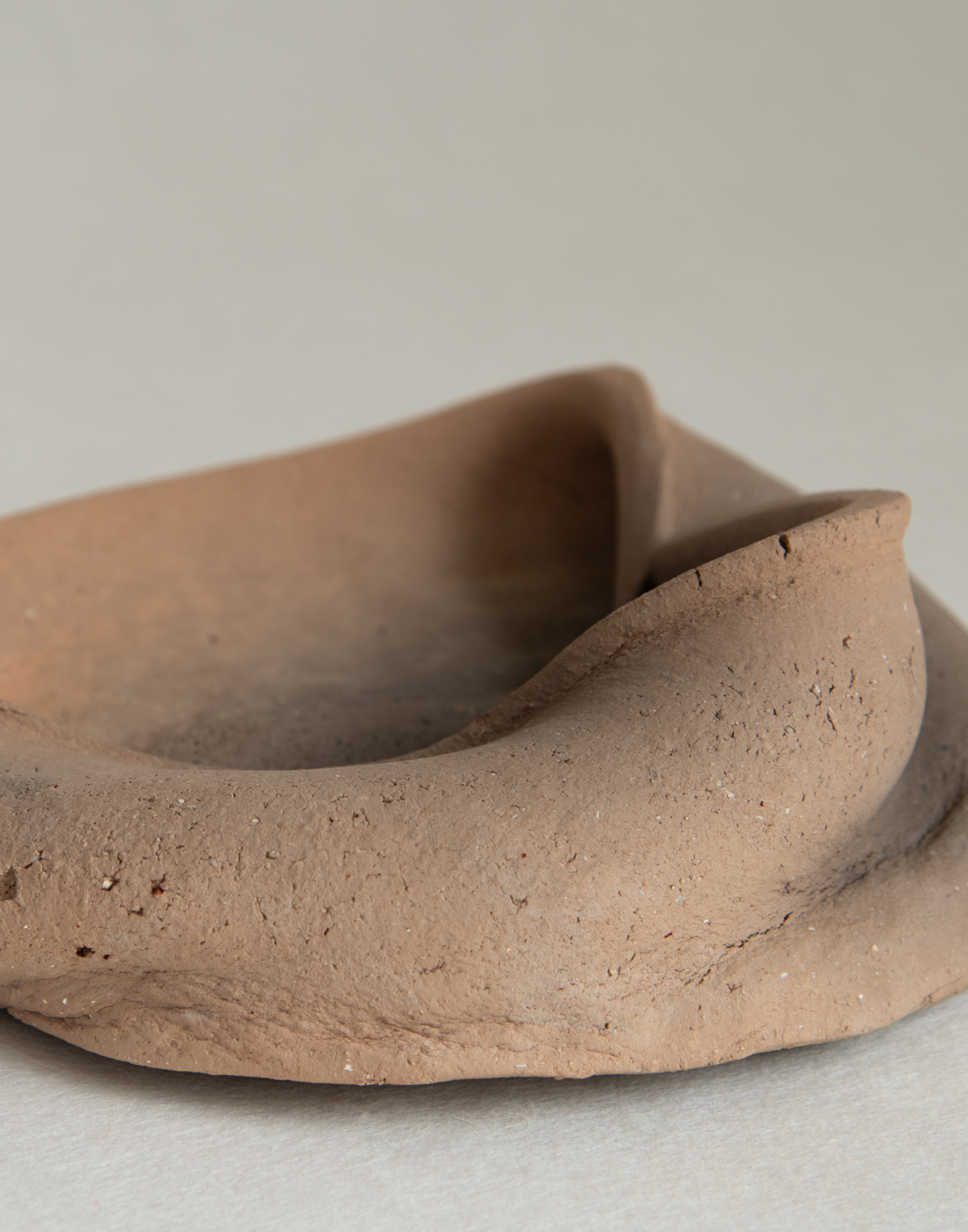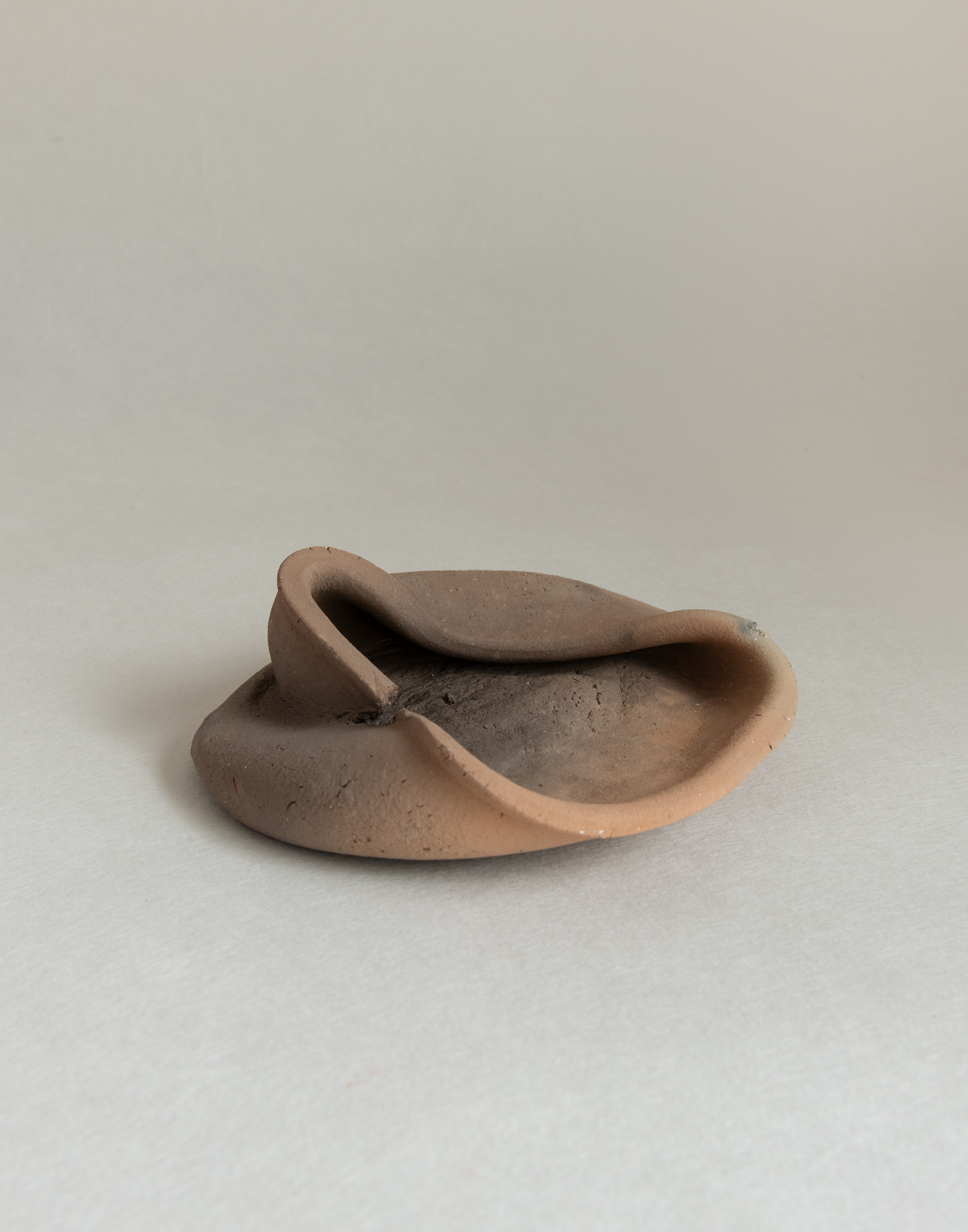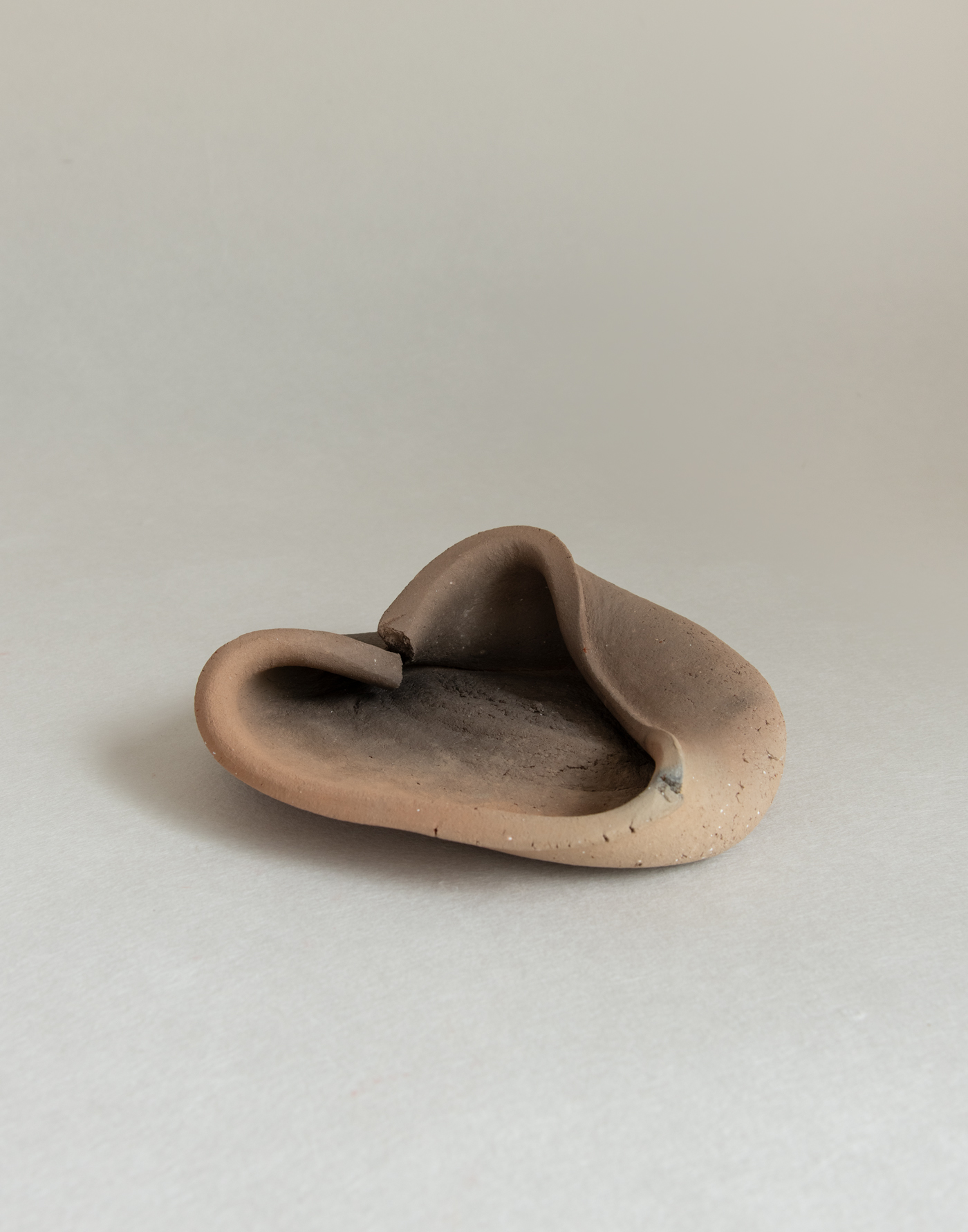 Works in which vessels and jars, hand-shaped by her own hands, are dropped from a height and then fired in an open flame. The resulting forms, distorted by the forces of nature, seem to melt into the earth or quietly settle like resting animals. Draped in visceral folds and creases, they emanate a curious sense of levitation despite their weight. Born of earth, water, and fire, these pieces carry with them even the unseen forces of time and gravity—tucked into the very pleats of their surfaces.
