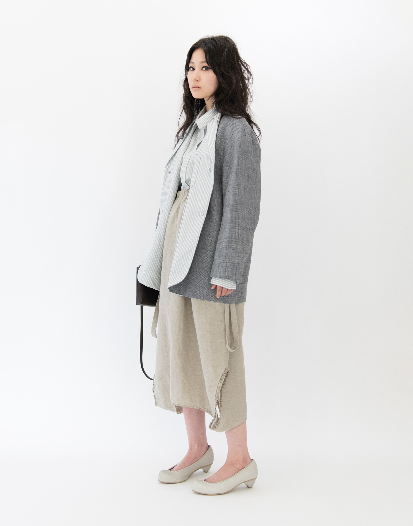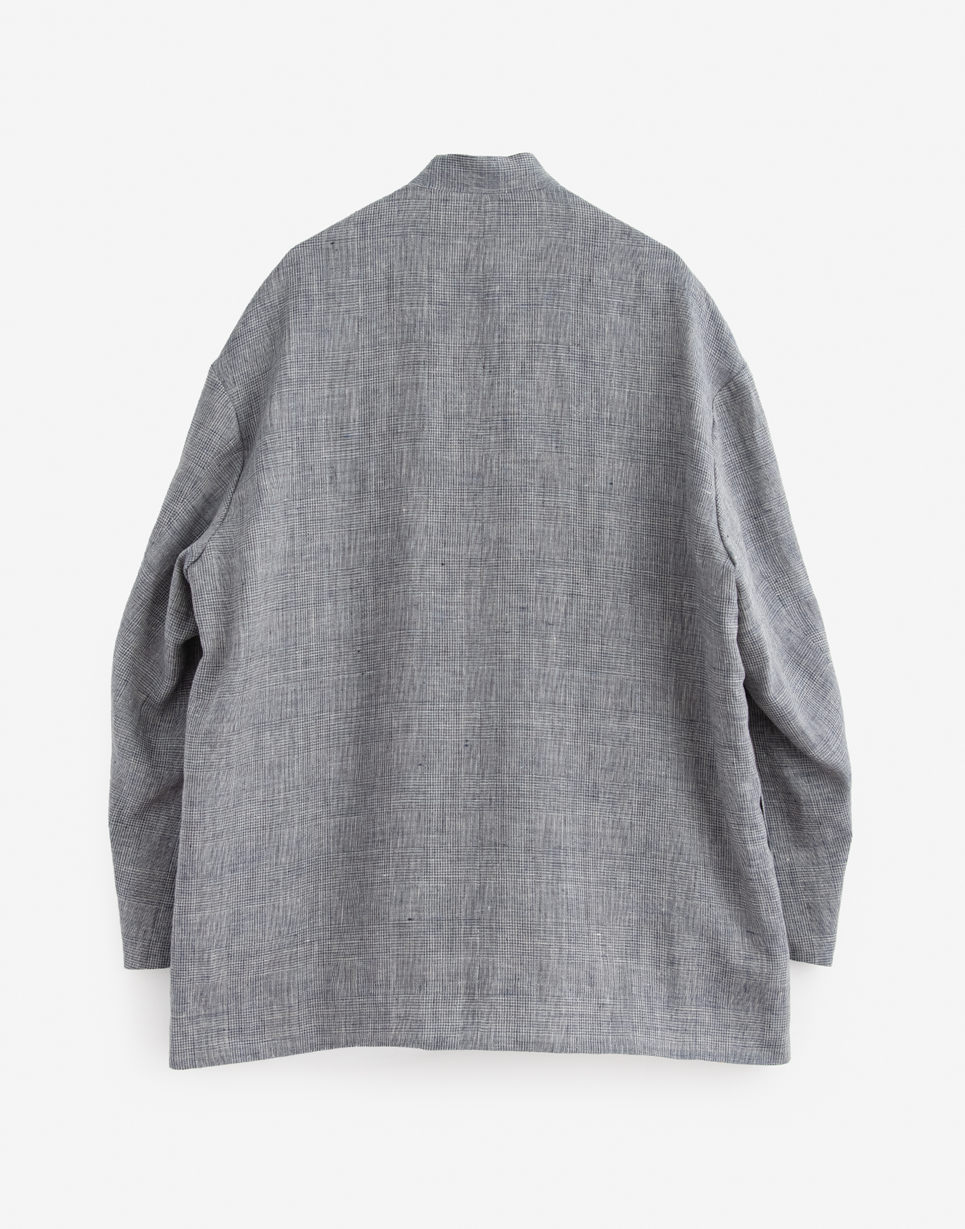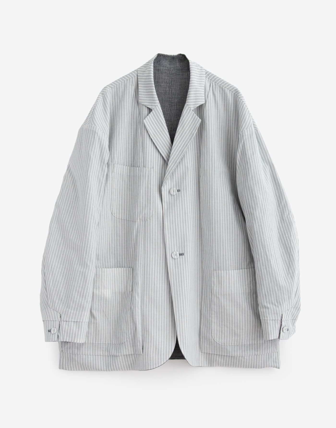 | Unique reversible jacket with tailored collar folded inside. Outer fabric is linen glen check, lining is striped organic cotton lawn. Linen 100% Lining: Organic cotton 100% Size: 0 Length 71.5 / Width 58 / Shoulder width 53.5 / Sleeve length 51.5 Size: 1 Length 73.5 / Width 61 / Shoulder width 54 / Sleeve length 52.5 *cm Model height 164cm, wearing Size 1 Click here for inquiries regarding size. |