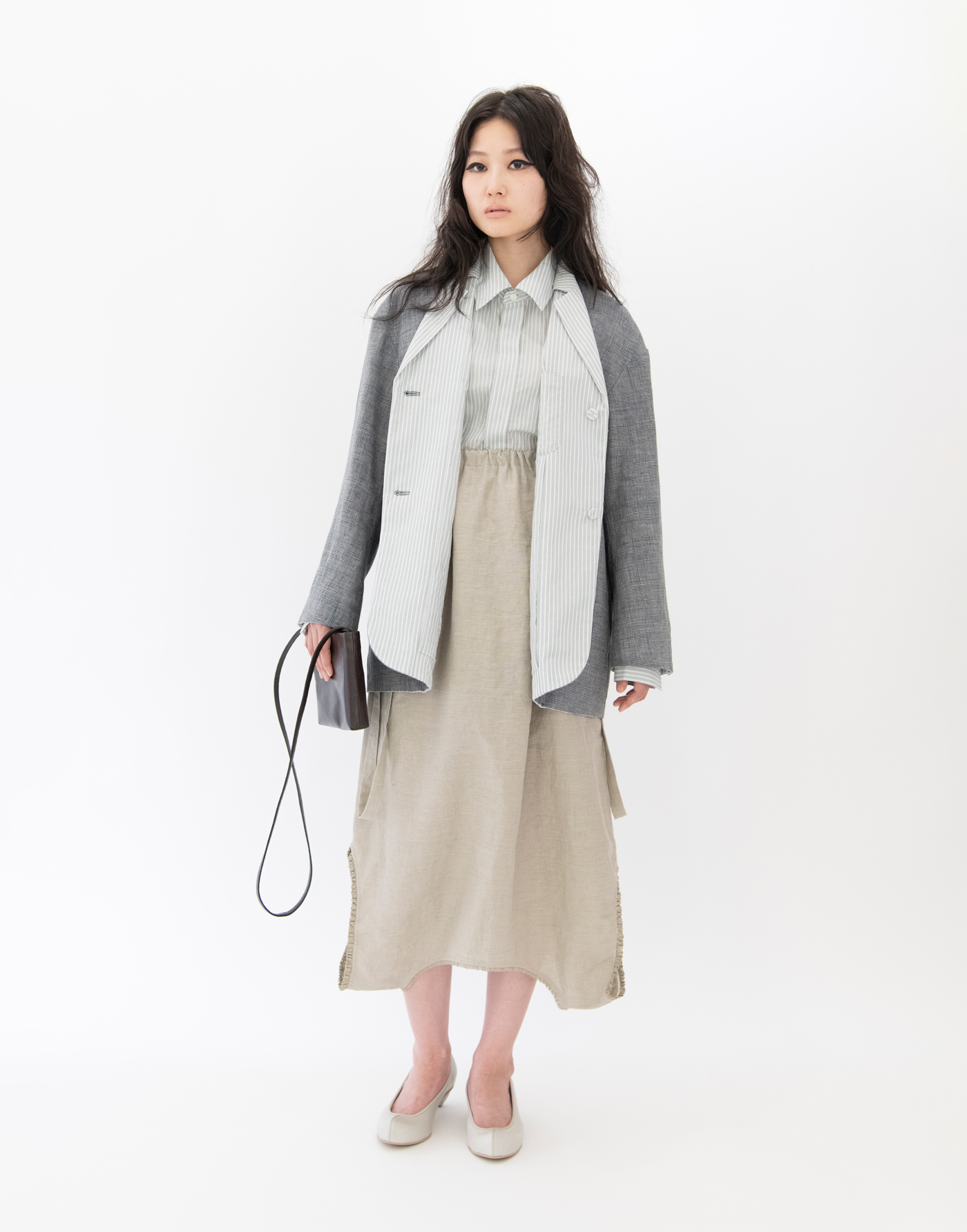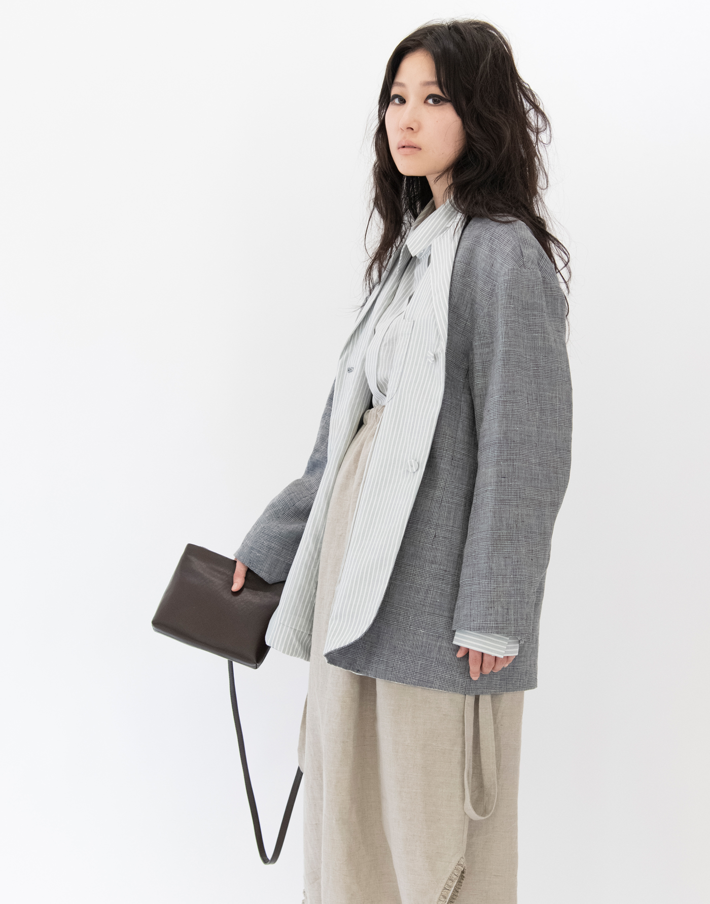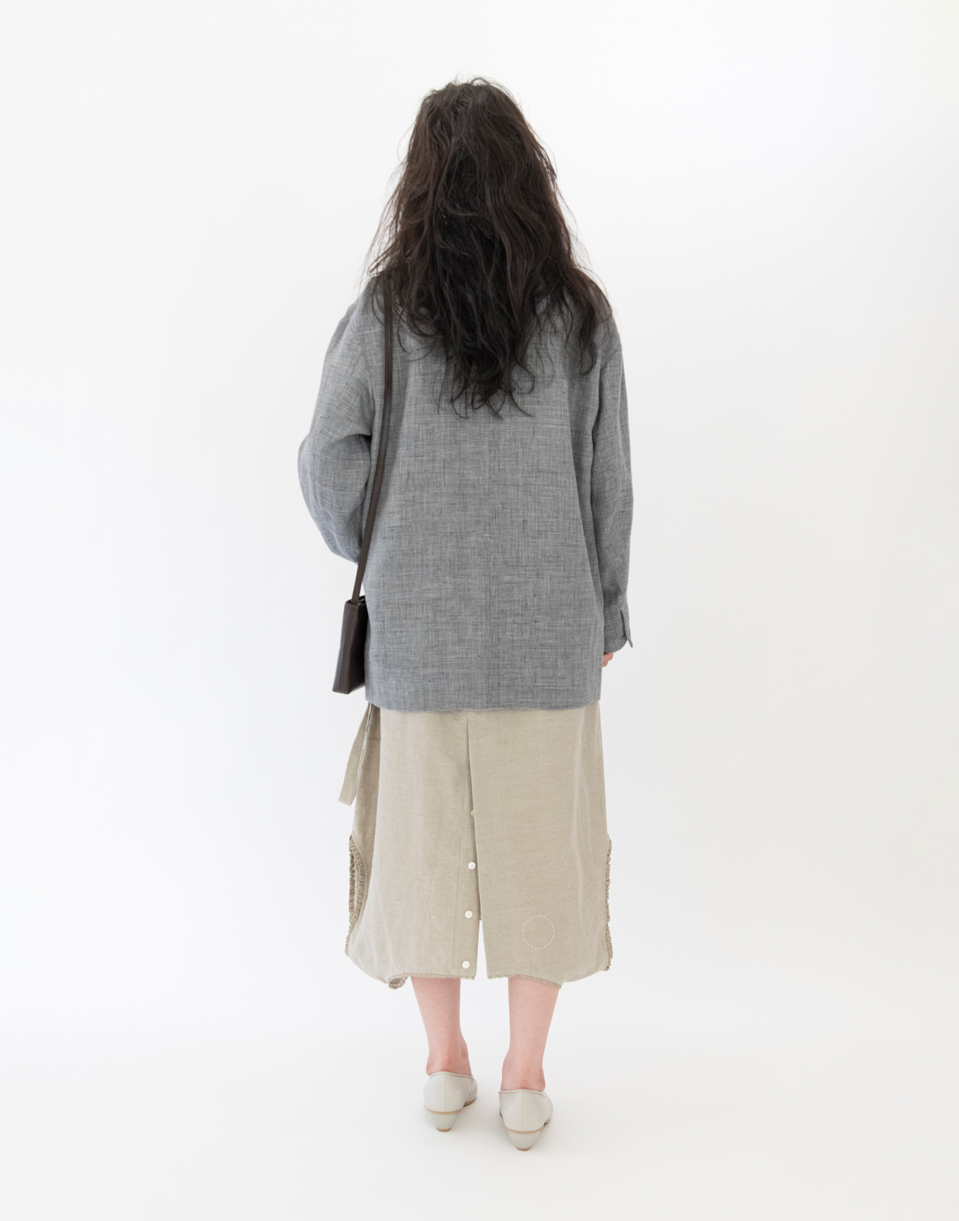 | Unique reversible jacket with tailored collar folded inside. Outer fabric is linen glen check, lining is striped organic cotton lawn. Linen 100% Lining: Organic cotton 100% Size: 0 Length 71.5 / Width 58 / Shoulder width 53.5 / Sleeve length 51.5 Size: 1 Length 73.5 / Width 61 / Shoulder width 54 / Sleeve length 52.5 *cm Model height 164cm, wearing Size 1 Click here for inquiries regarding size. |