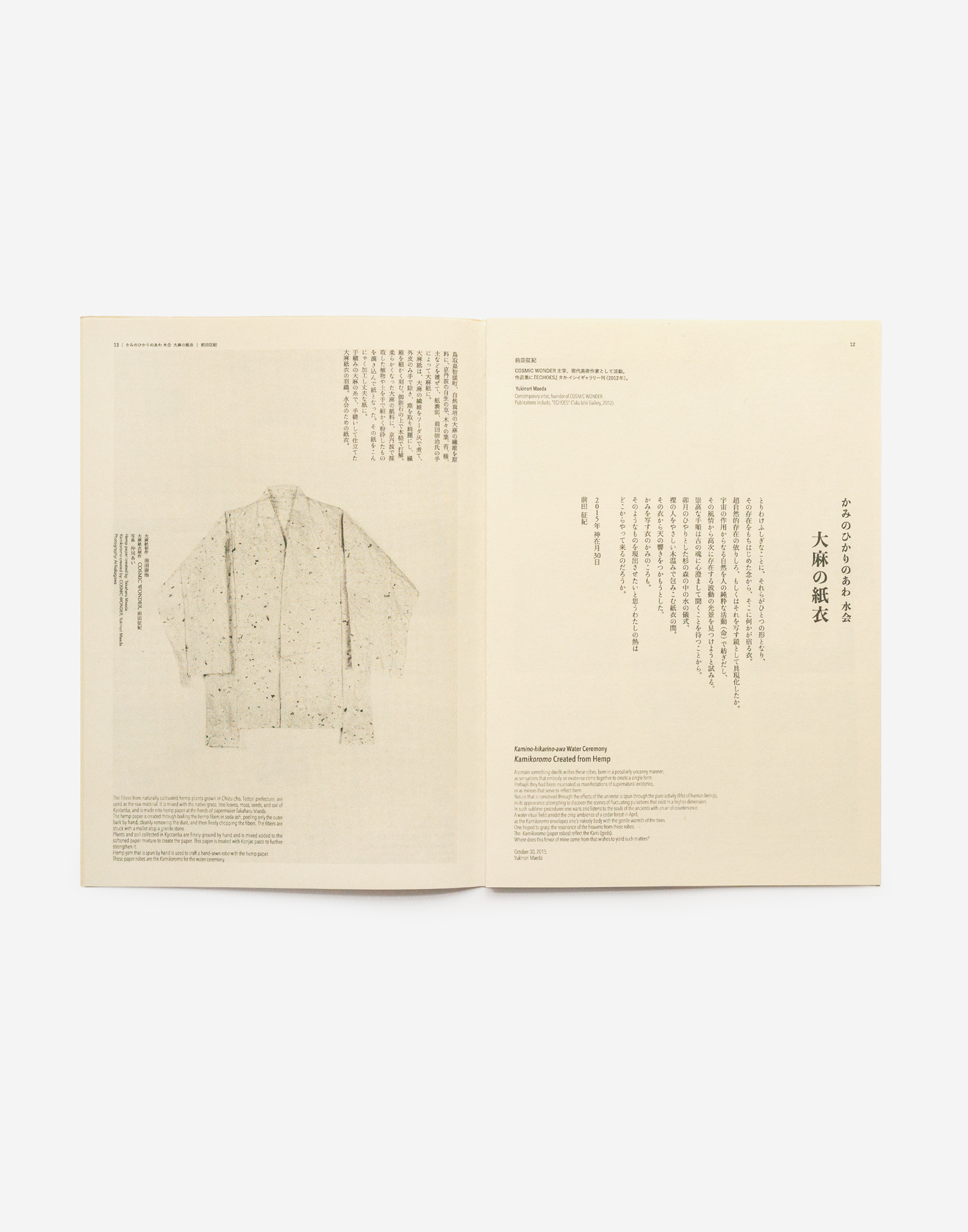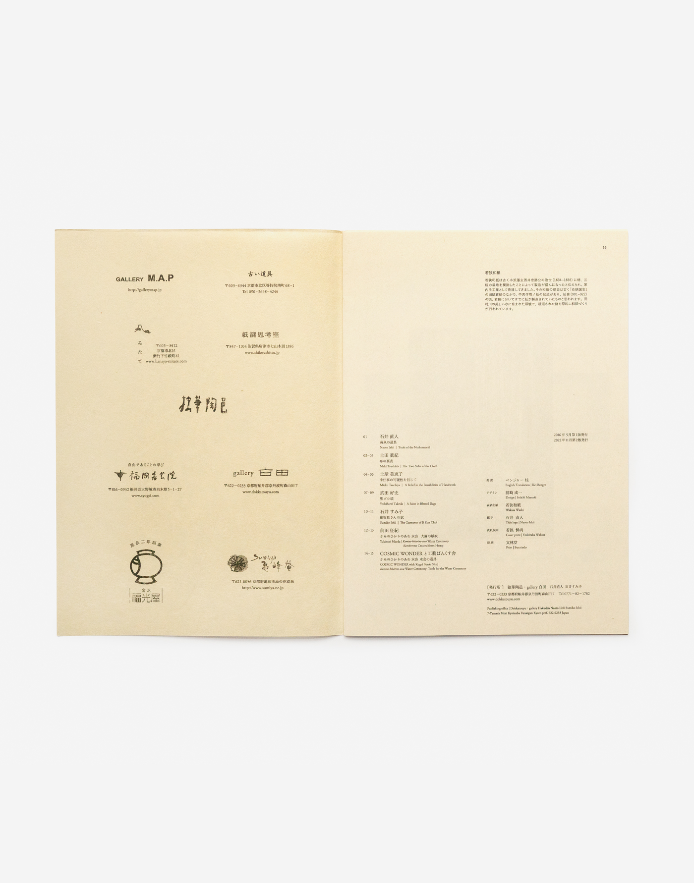 | “Fabric and Clothing” Special Feature Text from gallery hakuden: We invited individuals with deep knowledge of fabric and clothing to contribute essays from their unique perspectives. Each approach to fabric and clothing feels like a guiding principle for the craft of making things. The cover's fabric expression is a woodblock print by Yoshitaka Wakasa. Three-color, iridescent letterpress printing. The plump texture of Wakasa washi paper makes this a gentle volume to hold. Author: Naoto Ishii “Tools of the Yomi” Maki Tsuchida (Tsuchiya Textile Studio, Director of Nara Cotton Hand-Spinning Association) “The Front and Back of Cloth” “Believing in the Potential of Handwork” Yoshifumi Takeda (Japanese Aesthetics, Japanese Cultural Theory) “Ode to Sacred Rags” Sumiko Ishii Research and Photography: Kōgei Pankusha “The Clothing of Choi Ji-eun” Yukinorii Maeda (Contemporary Artist, Director of COSMIC WONDER) ”Kaminohikarinoawa” ”Mizu kai” ”Hemp Paper Clothing” COSMIC WONDER and Kōgei Pankusha ”Kaminohikarinoawa” ”Mizu kai” ” Hemp Paper Clothing” ”Tools of the Mizu kai” Photo: Kōgei Pankusha Cover Handmade Paper: Wakasa Washi Title Calligraphy: Naoto Ishii Cover Print: Yoshitaka Wakasa First Edition: March 2016 16 pages |