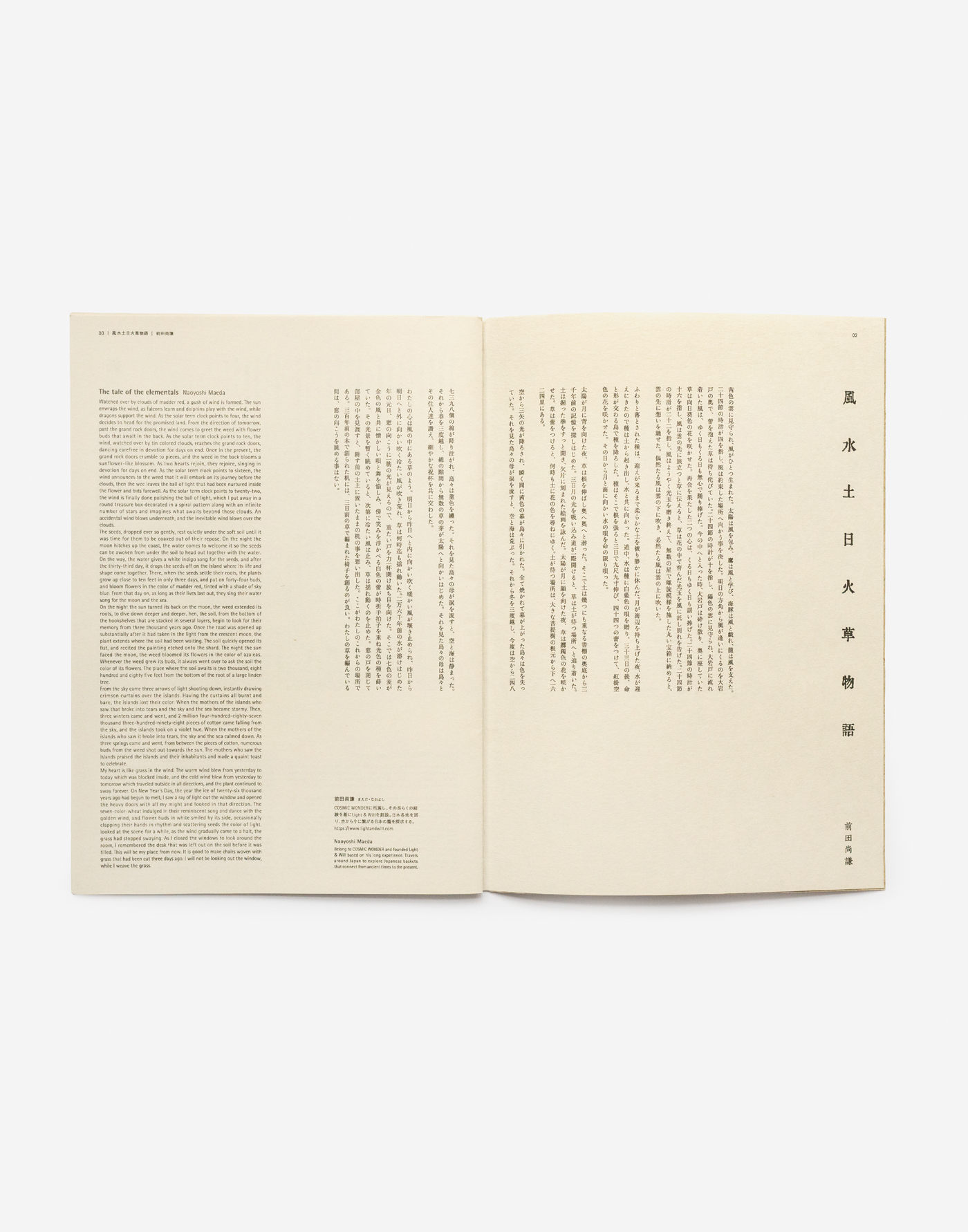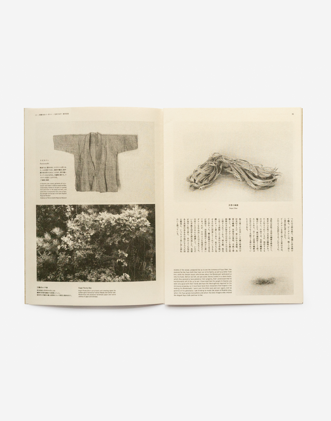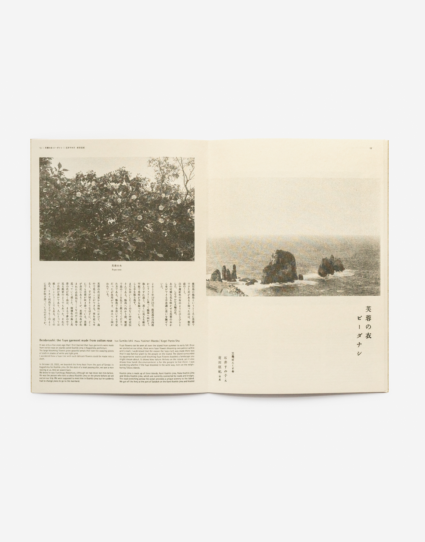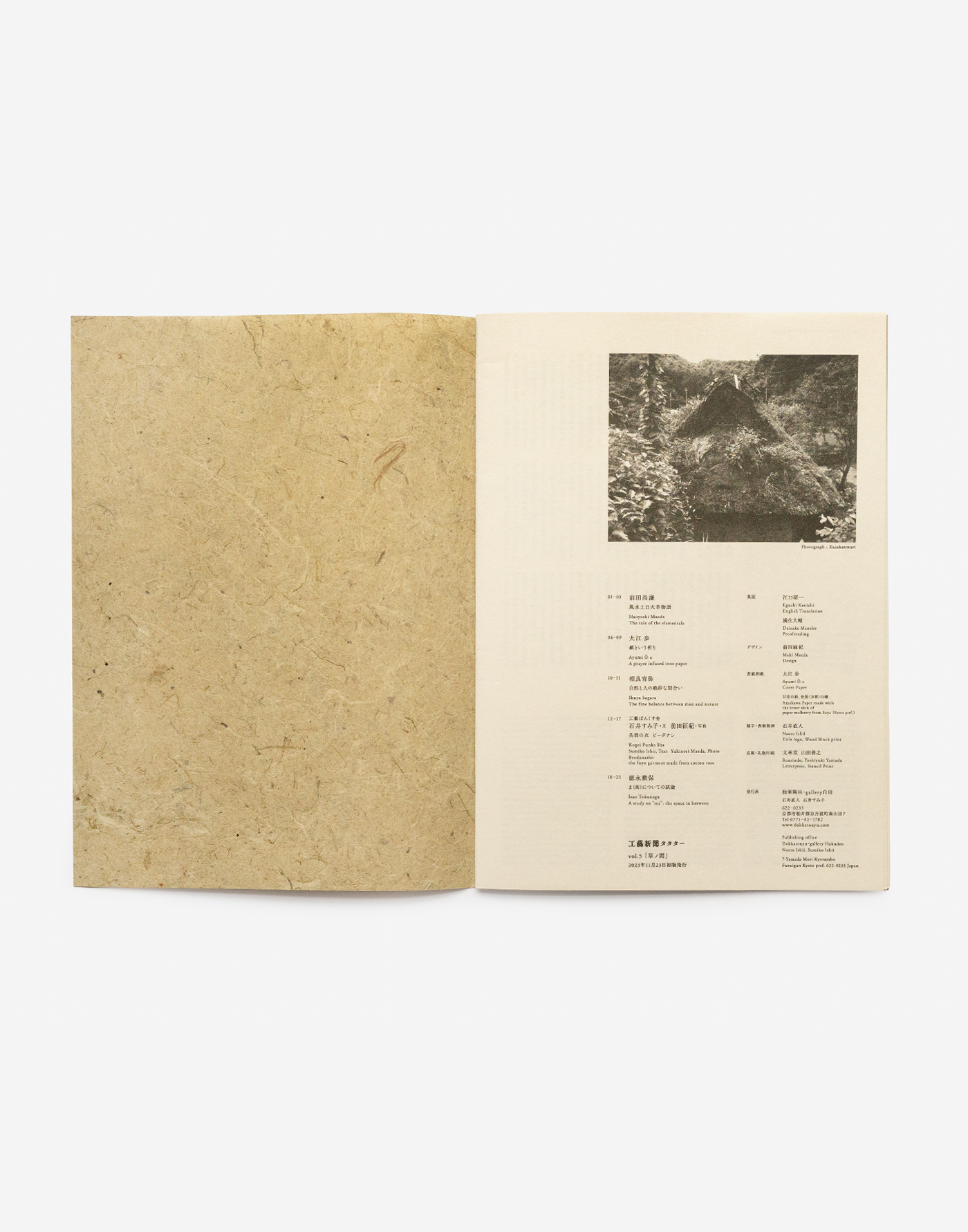 | “Among the Grasses” Special Feature Text from gallery hakuden: For those involved in the creation born from plants and trees, the timing and sensibility born from the relationship between grass, wood, and people, and the moments when intervals inevitably arise, It is written as if scooping up the words. The traditional Japanese paper 'washi' used for the cover is made from the inner bark of the paper mulberry tree by Ayumi Oe, a papermaker based in Kamiseya, Kyoto. Author: Naoyoshi Maeda(Light and Will) “The Tale of Wind, Water, Earth, Sun, Fire, and Grass” Ayumi Oe (Itookashi) “Prayer on Paper” Ikuya Sagara (Kusakanmuri) “The Exquisite Distance Between Nature and Man” Kōgei Pankusha Text: Sumiko Ishii Photograpy: Yukinori Maeda "Hibiscus mutabilis Robe: Beidanaashi” Kuniyasu Tokunaga “An Essay on ‘Ma (Space)’” Cover Washi Paper: Ayumi Oe Title Calligraphy & Cover Print: Naoto Ishii First Edition: November 2023 24 pages |