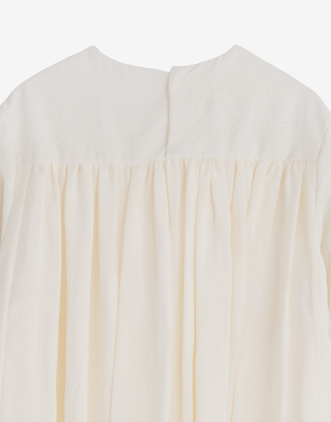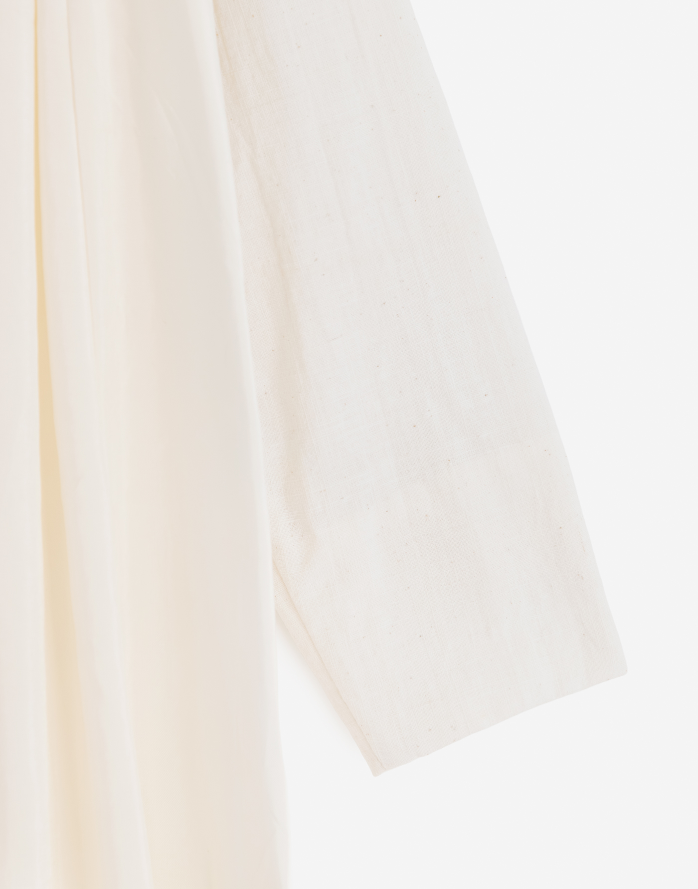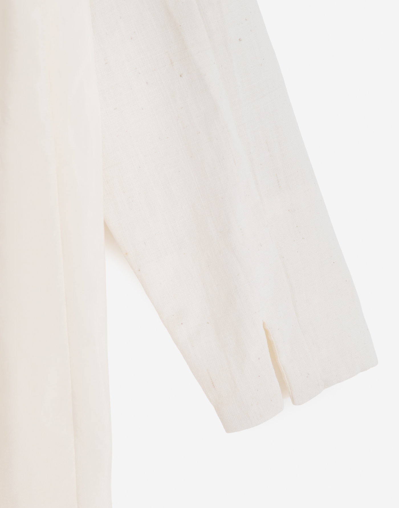 | An hand-woven old cotton from a Korean farmer It have been in a barn for a long time The expression that feels time is beautiful Combine with hand-woven silk and old cotton Yoke, Sleeve: Cotton 100% Body: Silk 100% Size: Free Length 129 / Chest width 53 / Shoulder width 38 / Sleeve length 56 / Cuff width 12 / Hem width 135 *cm Click here for inquiries regarding size. |