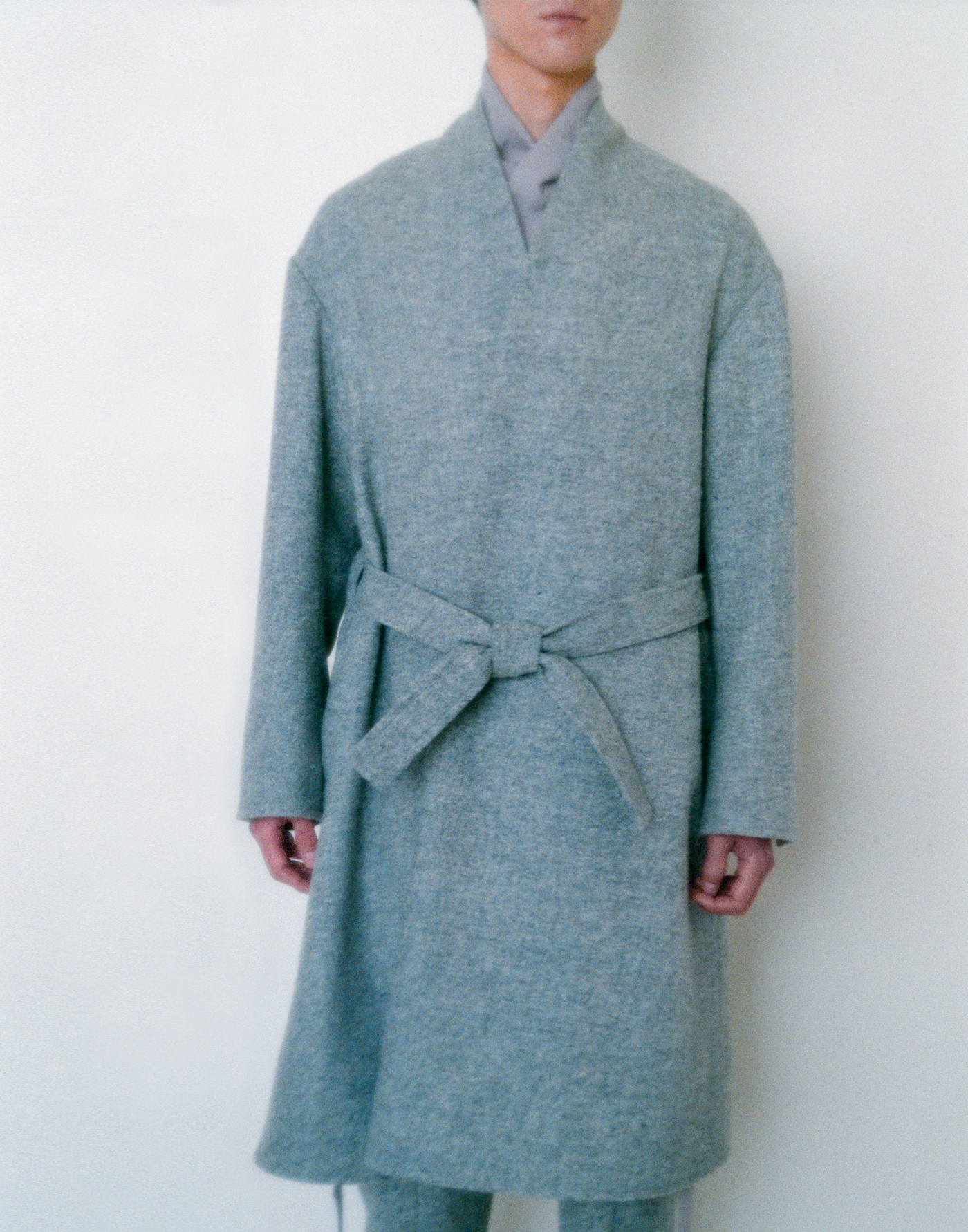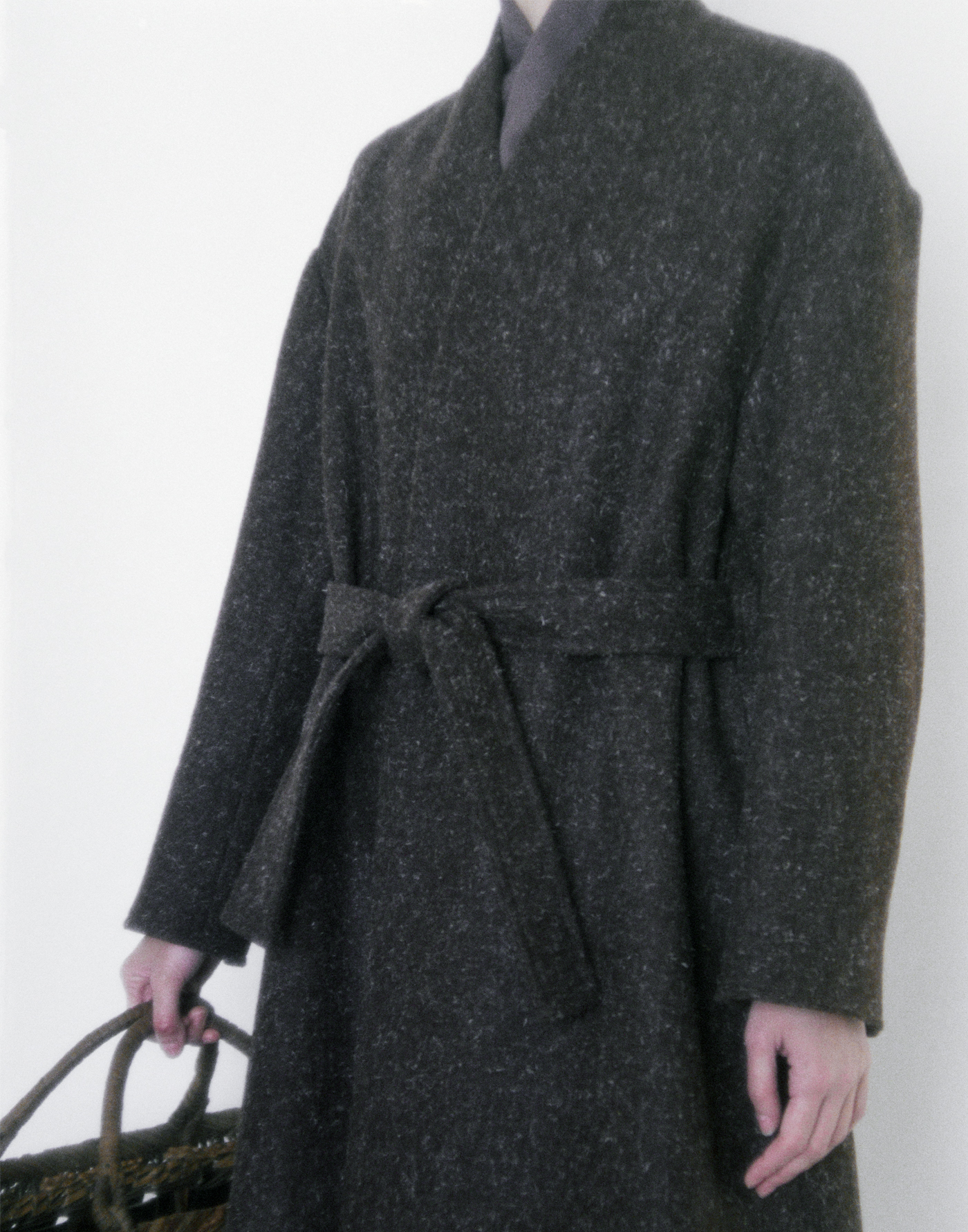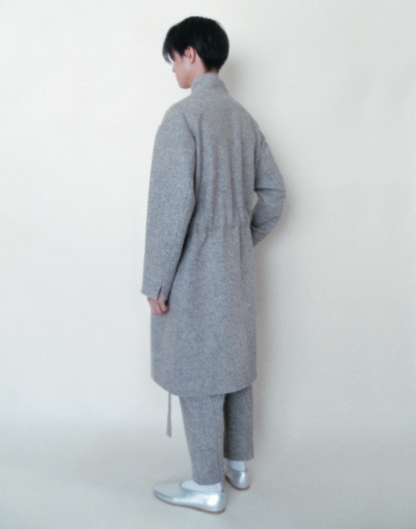| A collection of haori coats with three-dimensional sleeve. Melton fabric is made of English wool mixed with Kempi wool. Melton garments adapt to the body as they are worn and take on a shape that allows for ease of movement. The past converges with the present. A dream crosses into reality, A garment that transcends dimensions. Wool 100% Inside back, inner belt: Linen 100% Sleeve lining: Cupra 100% Specifications: Slit pockets on both sides Size: 3 Length 112 / Width 64 / Shoulder width 56 / Sleeve length 59.5 Size: 4 Length 115.5 / Width 66 / Shoulder width 57 / Sleeve length 61.5 *cm Gray: Model height 184cm, wearing size 4 Click here for inquiries regarding size. |