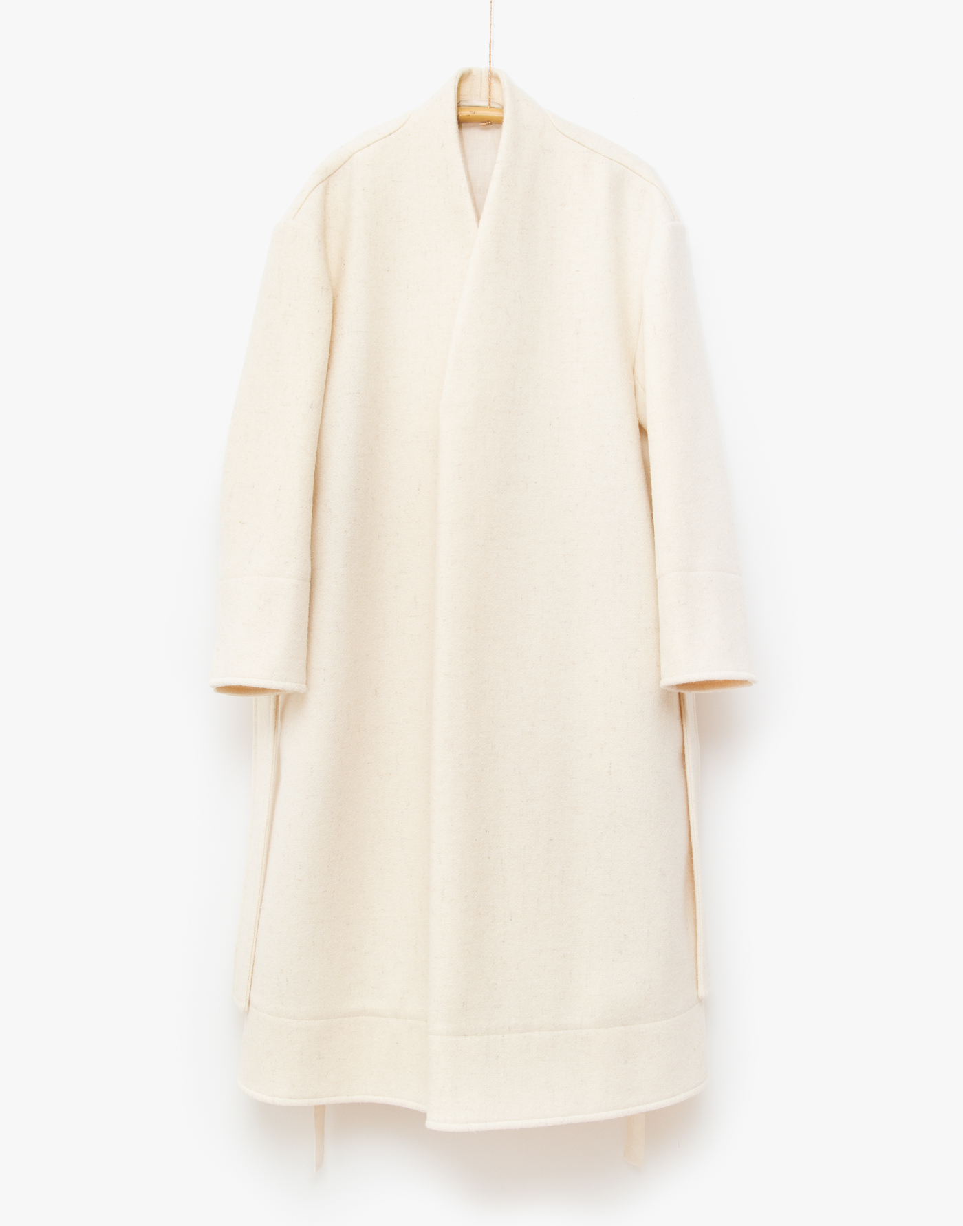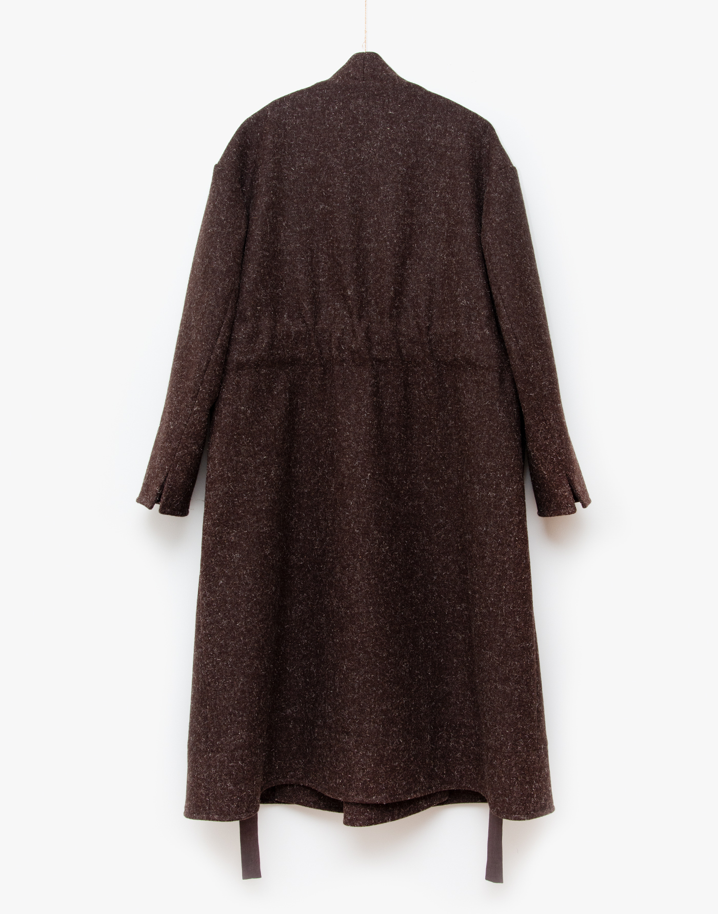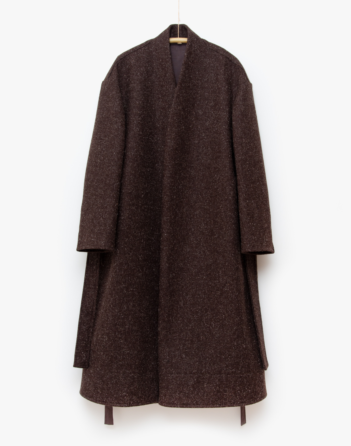 | A collection of haori coats with three-dimensional sleeve. Melton fabric is made of English wool mixed with Kempi wool. Melton garments adapt to the body as they are worn and take on a shape that allows for ease of movement. The past converges with the present. A dream crosses into reality, A garment that transcends dimensions. Wool 100% Inside back, inner belt: Linen 100% Sleeve lining: Cupra 100% Specifications: Slit pockets on both sides Size: 3 Length 112 / Width 64 / Shoulder width 56 / Sleeve length 59.5 Size: 4 Length 115.5 / Width 66 / Shoulder width 57 / Sleeve length 61.5 *cm Gray: Model height 184cm, wearing size 4 Click here for inquiries regarding size. |
