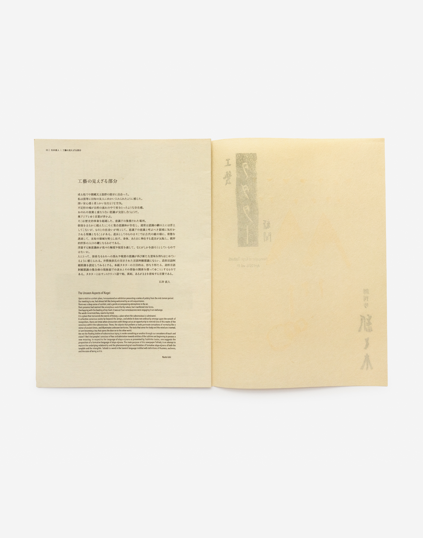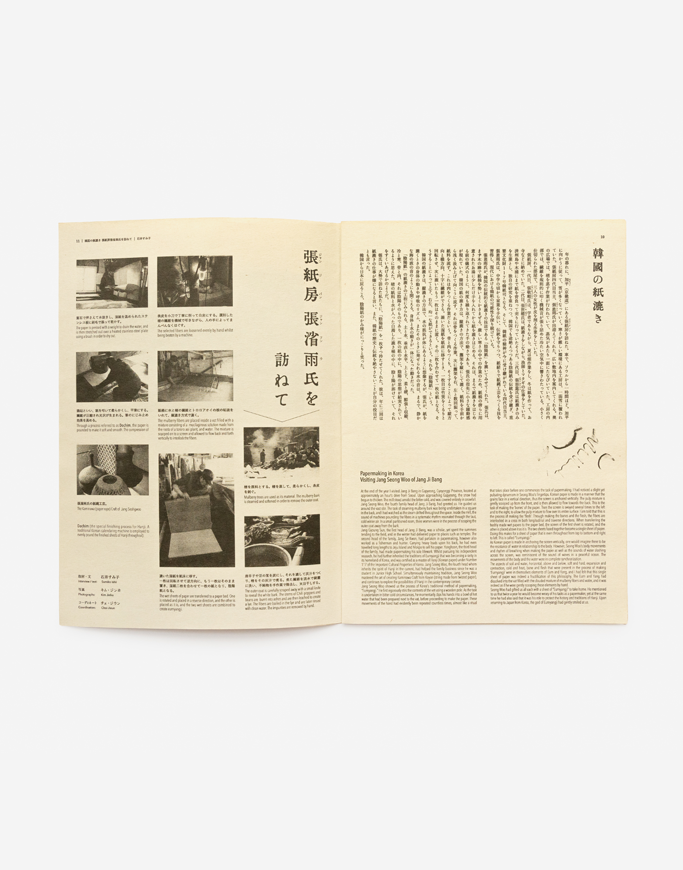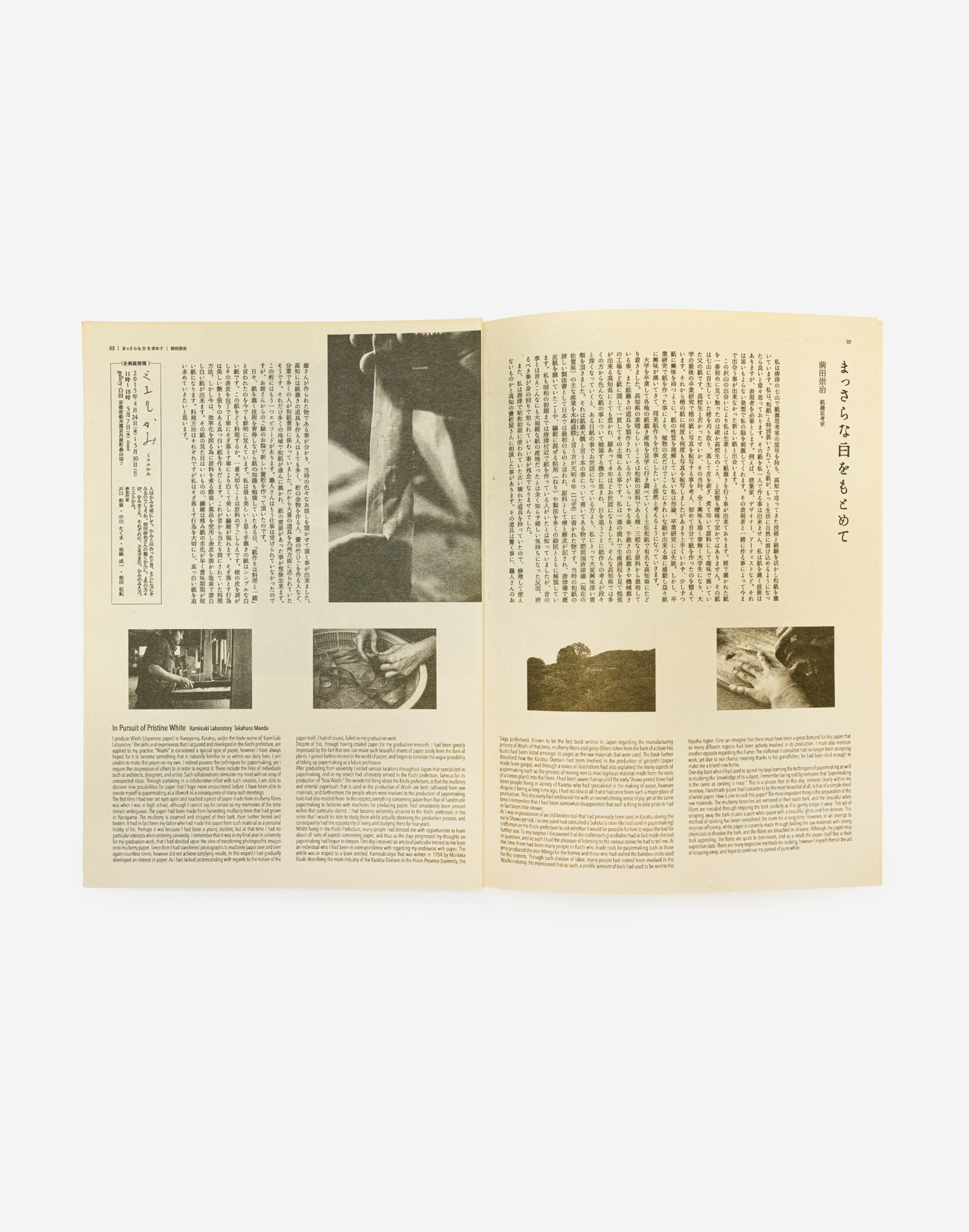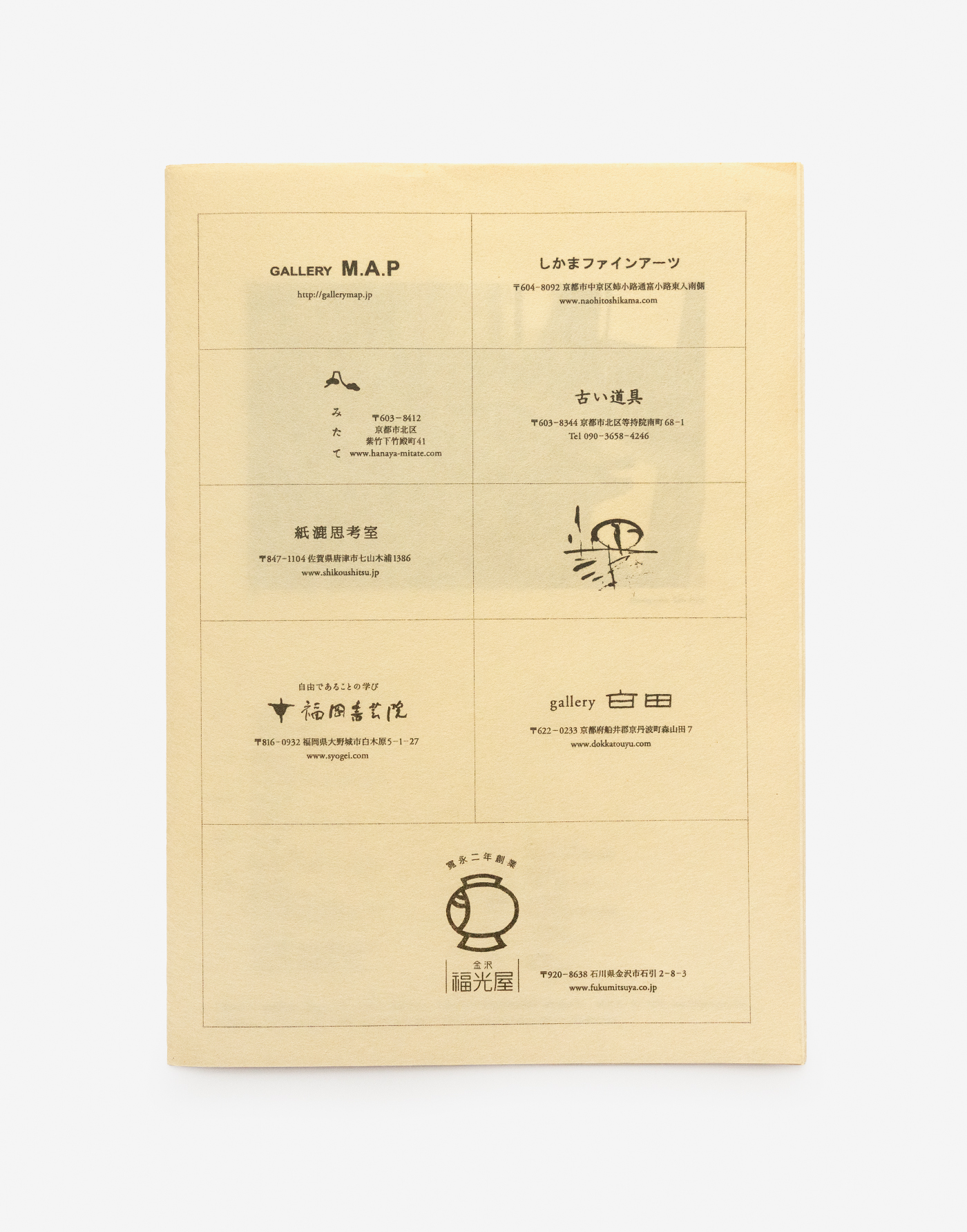 | “Paper and Wood” Special Feature Text from gallery hakuden: In this day and age, what does it mean to create and discover things? This is an attempt to articulate phenomena that remain unseen on the surface through the act of making things. We invite contributors from diverse fields to explore the possibilities of ”Kōgei” from every angle. To convey the sense of handcrafted work through the newspaper itself, each issue features a cover made from handmade paper. Printing is handled by Bunrindo in Fukuoka. The cover uses letterpress and stencil printing, while the text is stencil printed. We hope you'll pick it up and appreciate the handmade paper and the scent of the printing. It features Japanese-English bilingual text. We are grateful that this TATATAA could be published through exceptional craftsmanship and the cooperation of many people. Author: Naoto Ishii ”The Invisible Aspects of Kōgei” Takaharu Maeda (paper making artist) ”In Pursuit of Pure White” Shikama Naoto (Director, Shikama Fine Arts) ”What Draws Me In” Masaru Kawai (Woodworker artist) ”People, Nature, and Fragrance” Yoshifumi Takeda (Japanese Aesthetics and Japanese Cultural Studies) ”A Personal Theory of Suki” Sumiko Ishii (Kōgei Designer) ”Visiting Papermaking Workshop 장지방 in Korea” Photo: Kim Jinho Cover Handmade Paper: Takaharu Maeda Printing: Bunrintō Yoshiyuki Yamada First Edition: April 2015 Second Edition: February 2017 Third Edition: May 2018 Fourth Edition: March 2021 Fifth Edition: March 2024 12 pages |