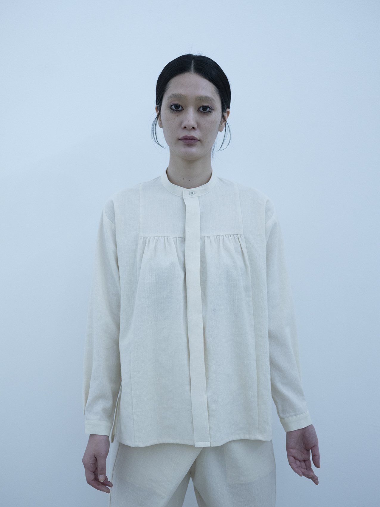 Light merino wool linen cotton glencheck elegant gathered shirt