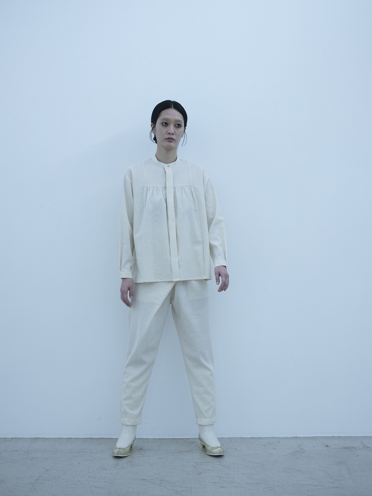 | This glen check is a combination of merino wool, linen, and cotton. Cotton yarns are slowly spun on an 18th century English-style spinning machine developed in the early days of the Industrial Revolution. The glen check is woven on a shuttle loom modeled on the principles of hand-weaving. An elegant gathered shirt. Wool 45%, Linen 29%, Cotton 26% Size 1 Length 68 / Width 54 / Cuff from front neck point (through Shoulder point) 76.5 / Cuff 22 *cm White: Model height 168cm, wearing size 1 Click here for inquiries regarding size. |