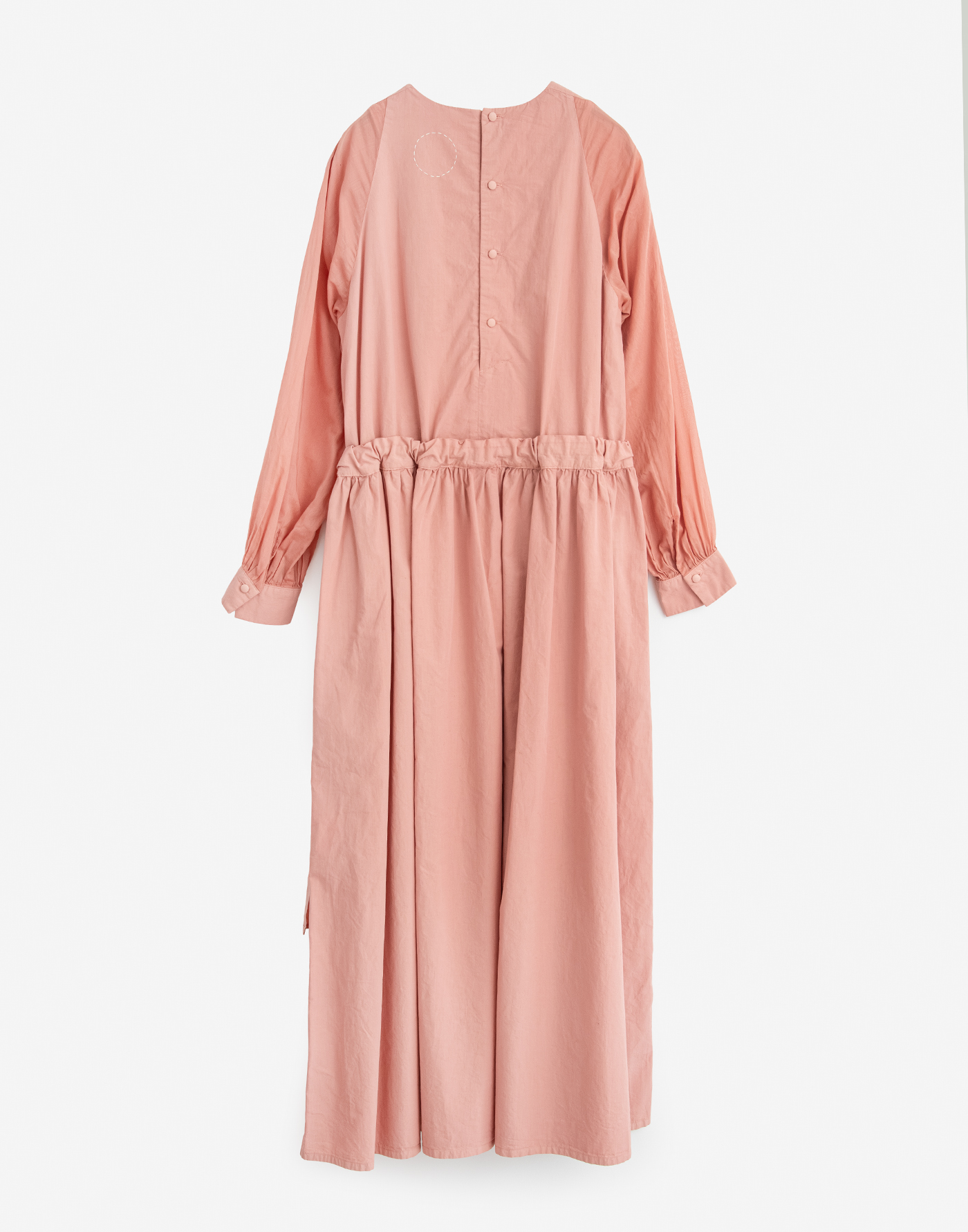 | A collection of organic cotton broad. The piece-dyeing process produces subtle variations of color. Collection made of 40 × 60s* broadcloth Farmer dresses with cotton lawn sleeves. Color is Rose crystal. Organic cotton 100% Sleeve: Cotton 100% Size: 1 Length 124 / Width 49 / Cuff from front neck point (through Shoulder point) 74 *cm Click here for inquiries regarding size. |