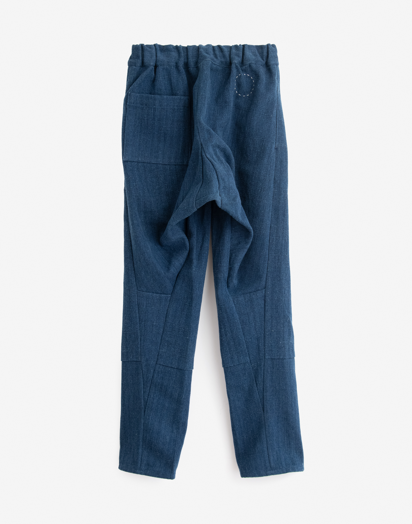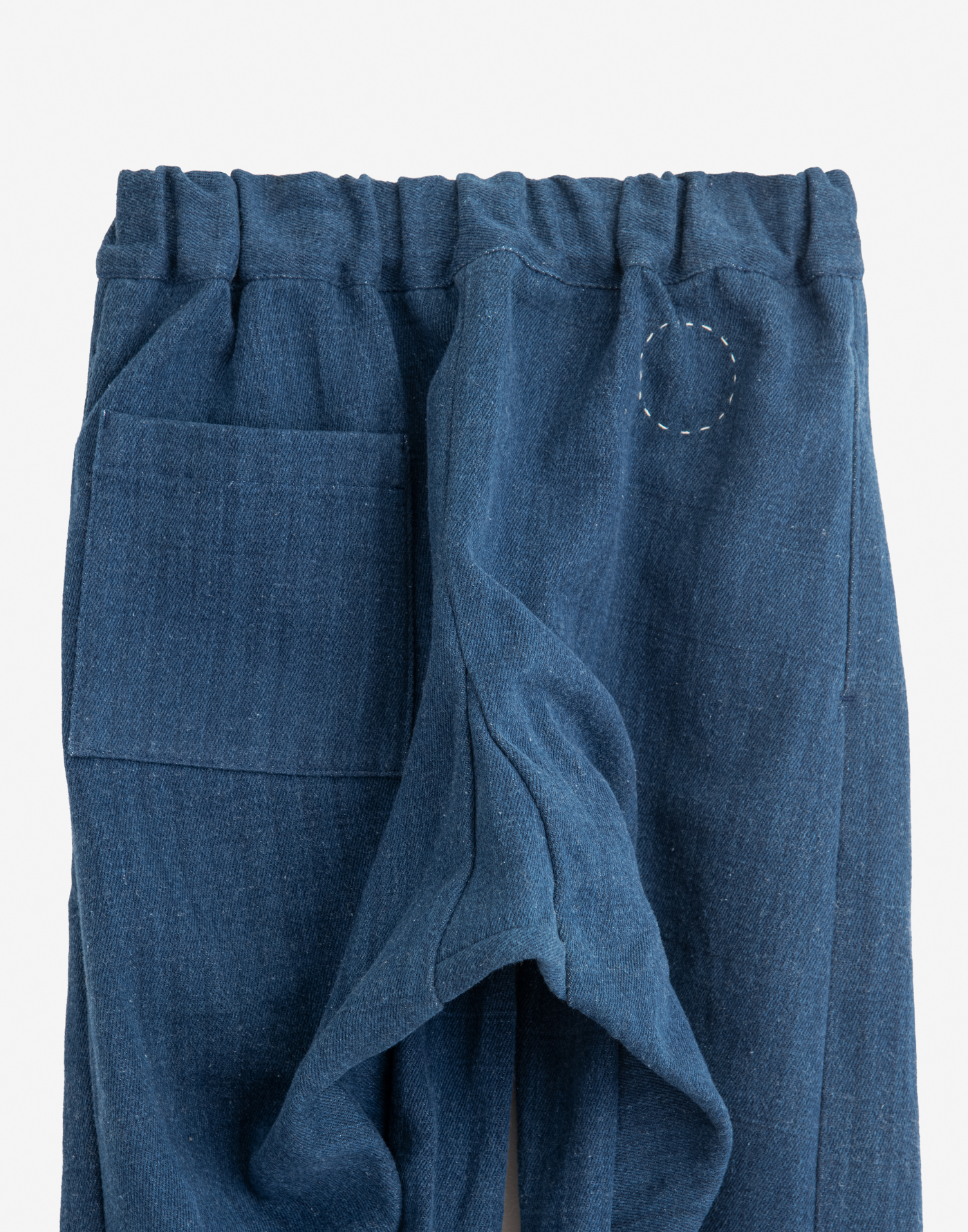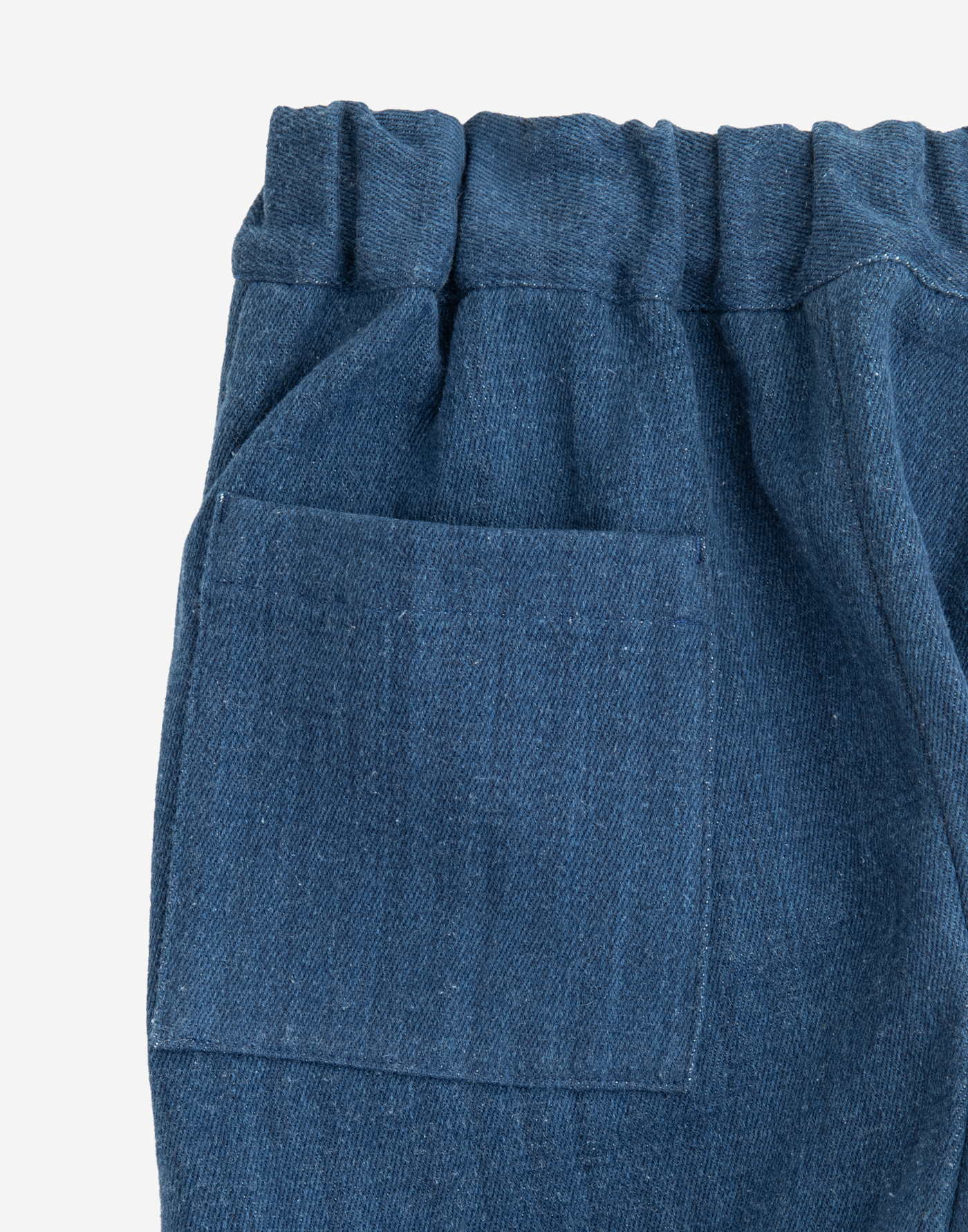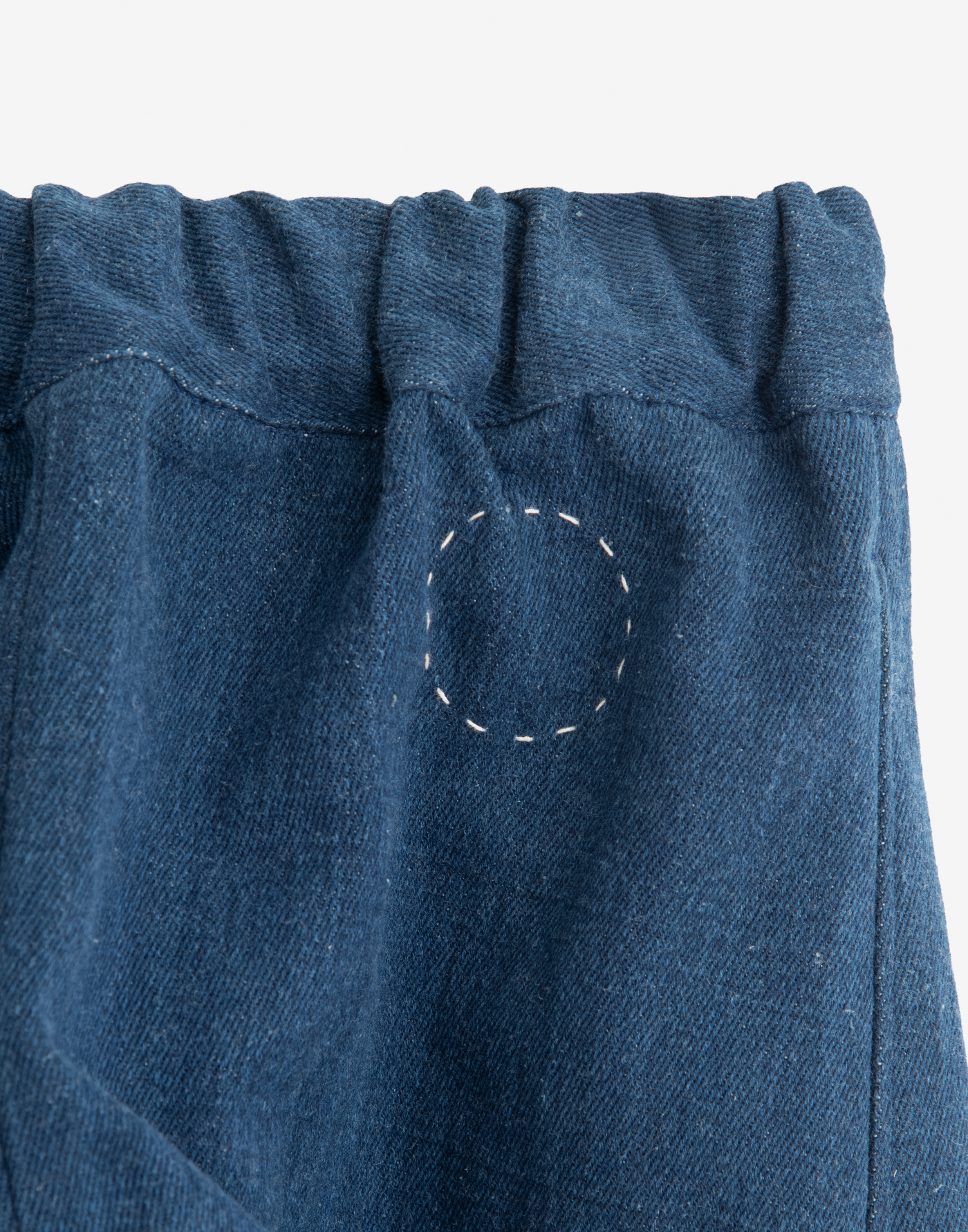 | Made from Organic Kala Cotton, a native Indian cotton, dyed with indigo and hand-woven in twill weave. Workwear reminiscent of old denim pants. Fabric: Kala Cotton Spinning: Spinning Mill Weaving: Handloom Dyeing: Natural Indigo dye Processing: Sanforised Kala Cotton Kala cotton is a native Indian cotton grown in an environment where water and fertile land are scarce. It is called Kala, which in Sanskrit can mean “black”, because the calyx of the cotton plant looks black like a hard shell. Because it naturally deters pests like the pink bollworm, which are attracted to cotton, it does not require pesticides. The fiber length is as short as 20~22mm, and the fiber thickness is as thick as 5μ. It does not require irrigation facilities and chemical fertilizers, and is a sustainable material that is in harmony with the farmers and the environment. Kala Cotton is in harmony with the earth, nature, and human, enriching our senses and our lives. Cotton 100% Size: 0 Waist 63 / Outseam 89.5 / Rise 27 / Inseam 71 / Lap circumference 32 Size: 1 Waist 66 / Outseam 91 / Rise 28 / Inseam 73 / Lap circumference 32.5 Size: 3 Waist 69 / Outseam 95 / Rise 30 / Inseam 76 / Lap circumference 34 Size: 4 Waist 72 / Outseam 96 / Rise 31 / Inseam 79 / Lap circumference 36 *cm Click here for inquiries regarding size. |