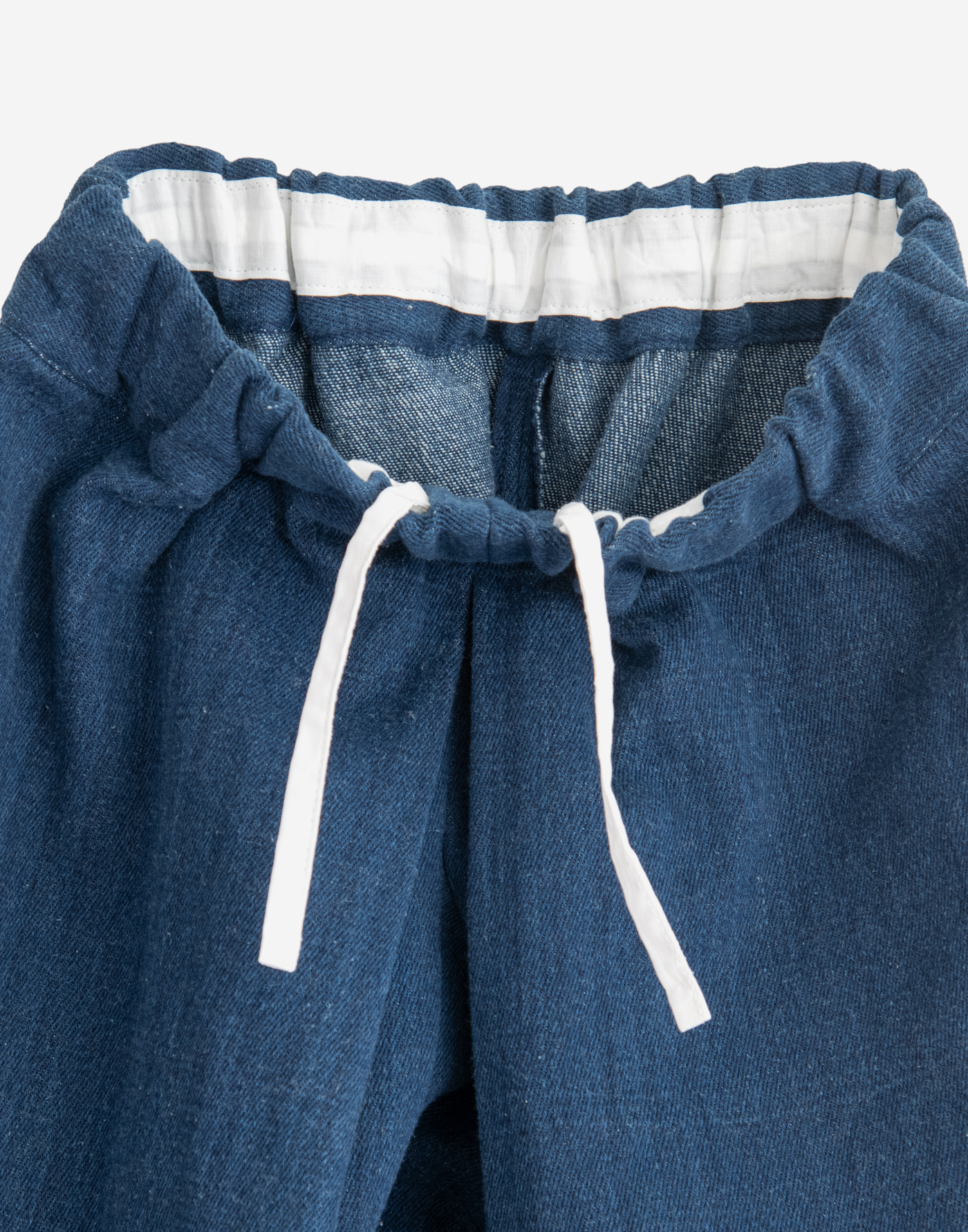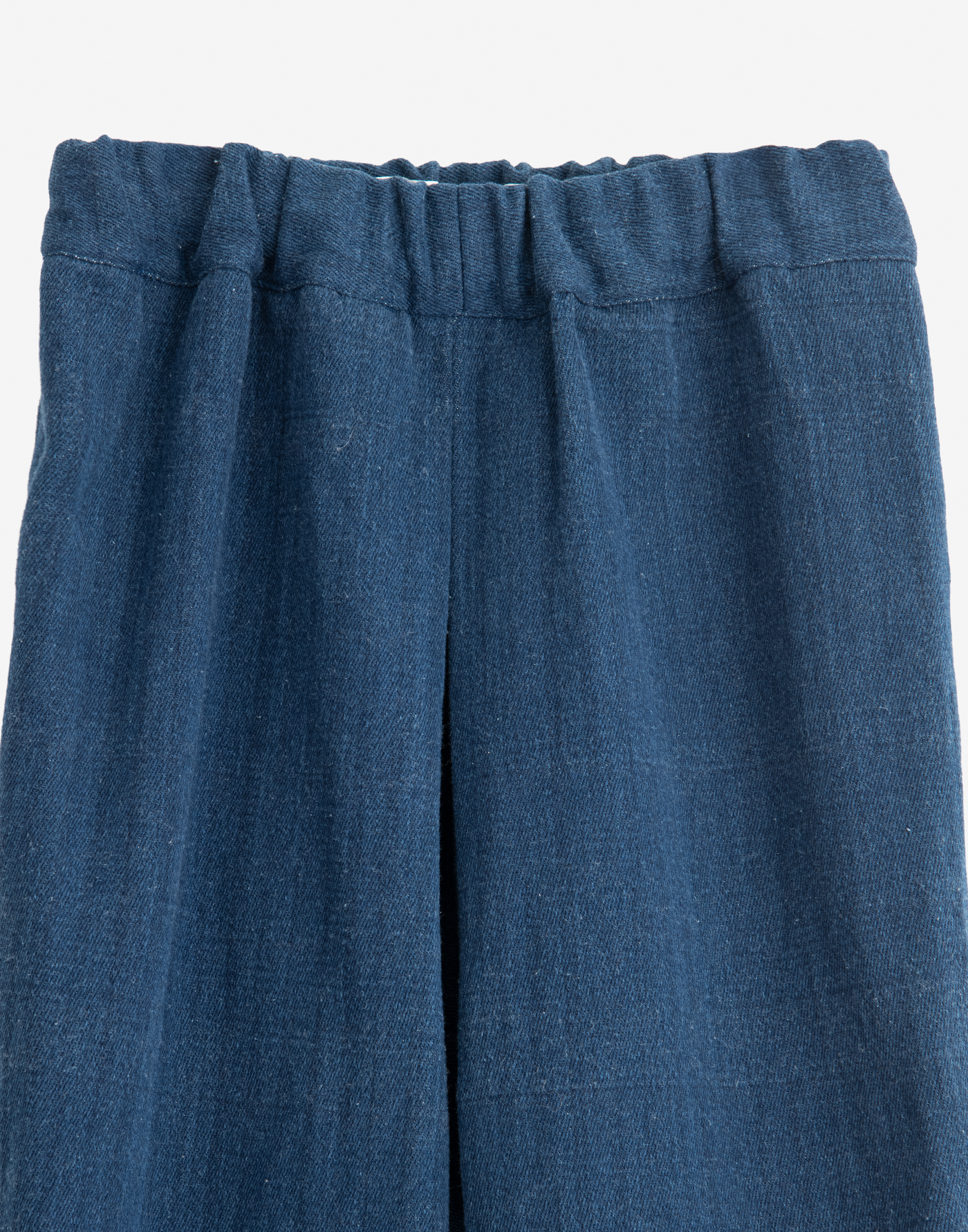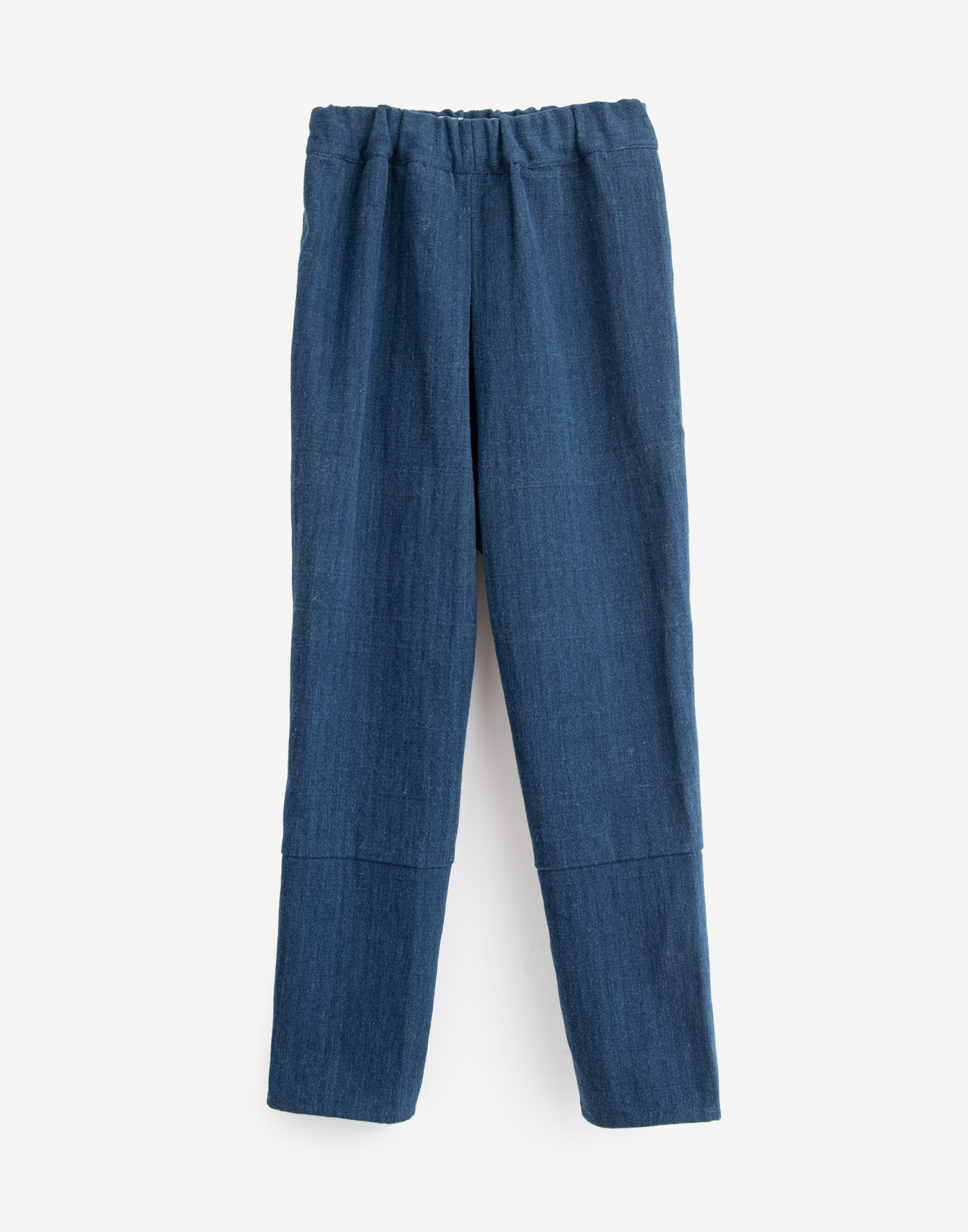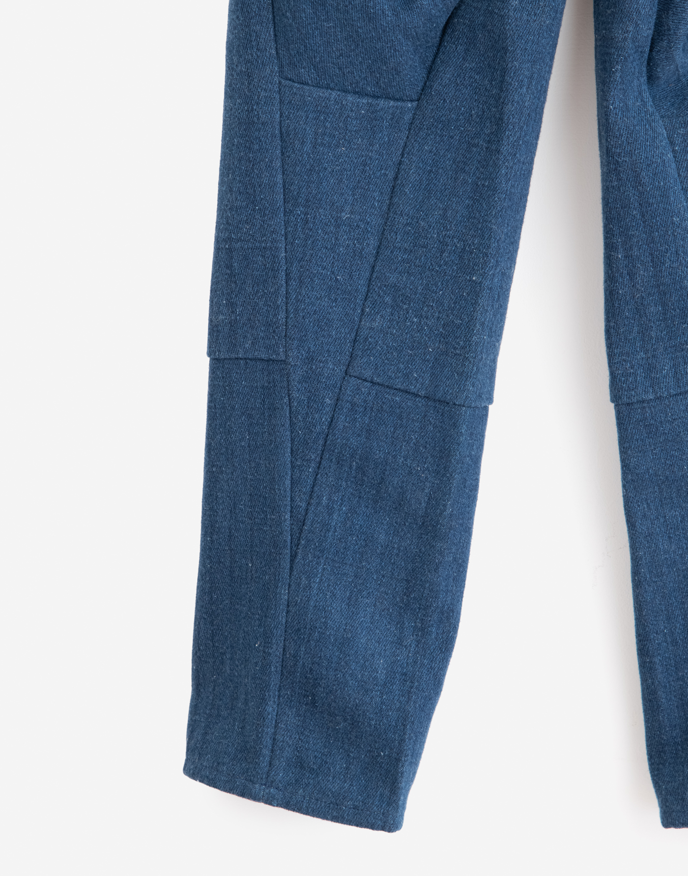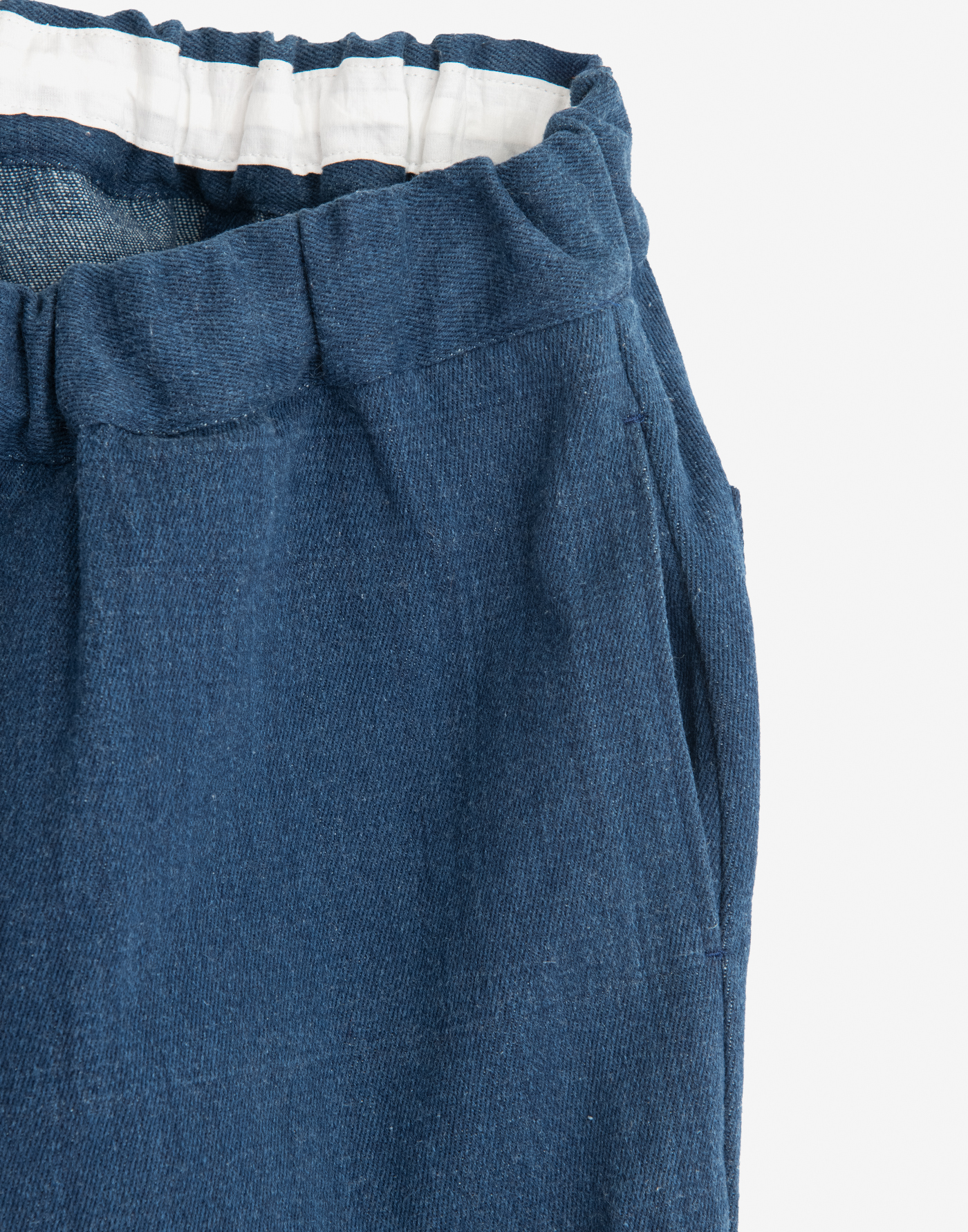 | Made from Organic Kala Cotton, a native Indian cotton, dyed with indigo and hand-woven in twill weave. Workwear reminiscent of old denim pants. Fabric: Kala Cotton Spinning: Spinning Mill Weaving: Handloom Dyeing: Natural Indigo dye Processing: Sanforised Kala Cotton Kala cotton is a native Indian cotton grown in an environment where water and fertile land are scarce. It is called Kala, which in Sanskrit can mean “black”, because the calyx of the cotton plant looks black like a hard shell. Because it naturally deters pests like the pink bollworm, which are attracted to cotton, it does not require pesticides. The fiber length is as short as 20~22mm, and the fiber thickness is as thick as 5μ. It does not require irrigation facilities and chemical fertilizers, and is a sustainable material that is in harmony with the farmers and the environment. Kala Cotton is in harmony with the earth, nature, and human, enriching our senses and our lives. Cotton 100% Size: 0 Waist 63 / Outseam 89.5 / Rise 27 / Inseam 71 / Lap circumference 32 Size: 1 Waist 66 / Outseam 91 / Rise 28 / Inseam 73 / Lap circumference 32.5 Size: 3 Waist 69 / Outseam 95 / Rise 30 / Inseam 76 / Lap circumference 34 Size: 4 Waist 72 / Outseam 96 / Rise 31 / Inseam 79 / Lap circumference 36 *cm Click here for inquiries regarding size. |